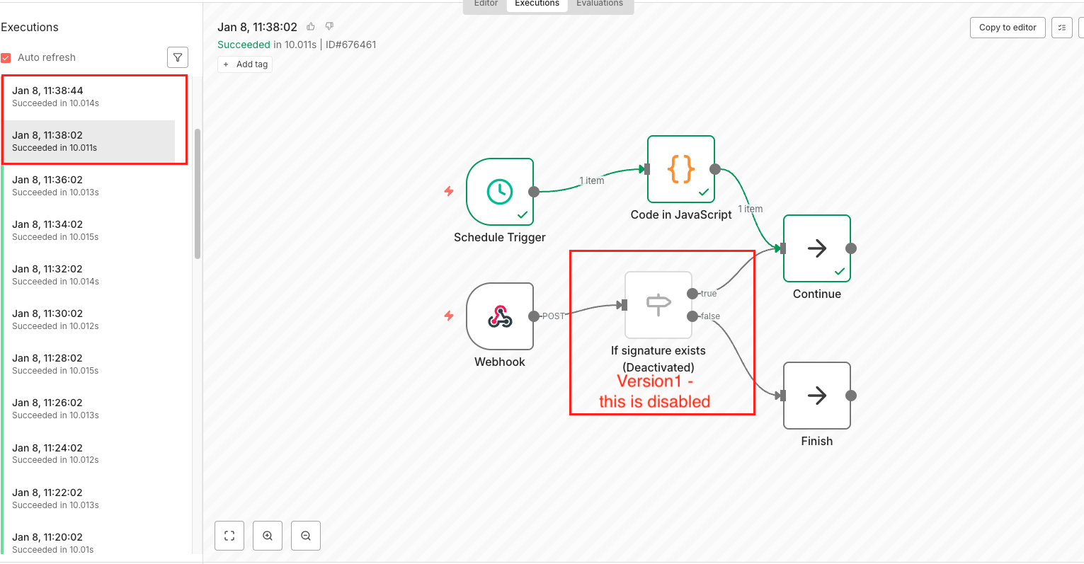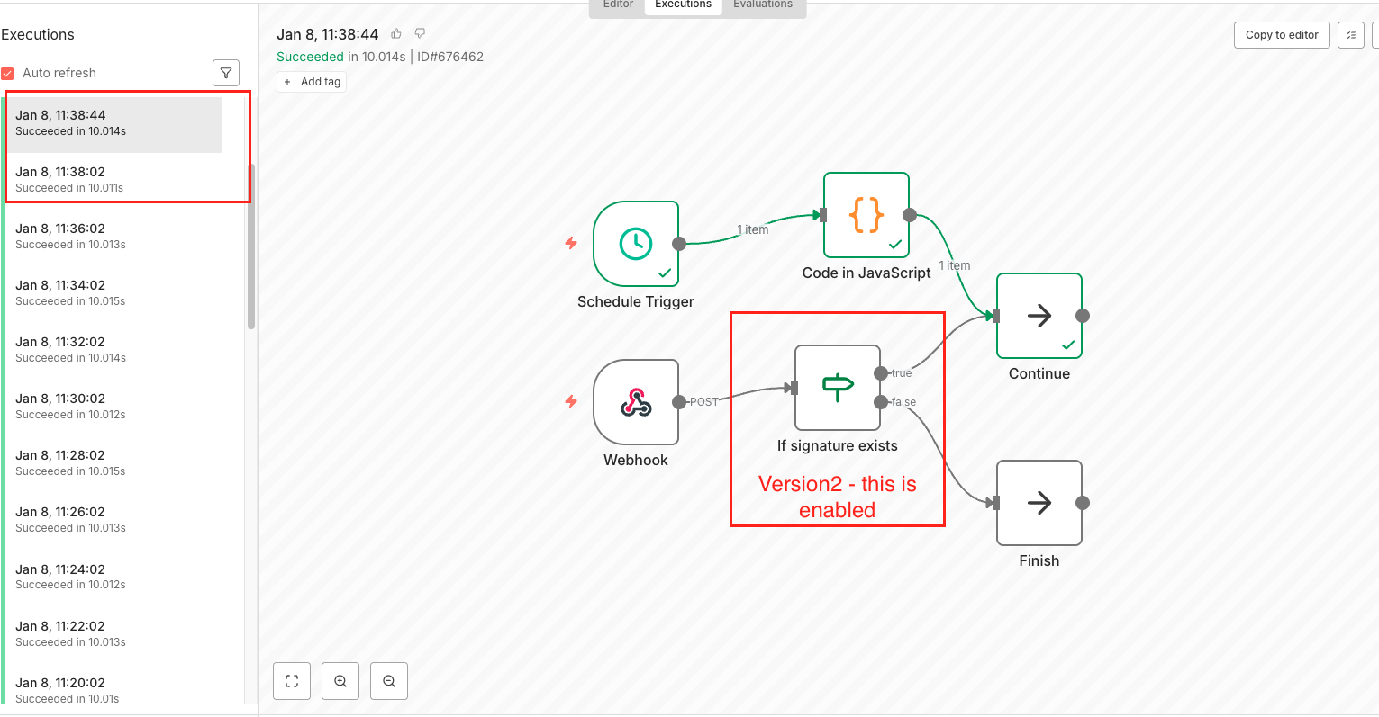 When the workflow is edited (and thus a new version of the workflow is created) we see that the scheduled trigger is now executed twice. Looking at the details of the duplicate executions, we can see that one execution is from the original workflow version, and the 2nd execution is from the updated version of the workflow.