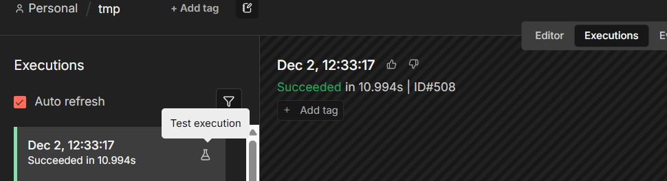 Executions that don’t have this icon are production runs. These are automatic executions that ran when the workflow is active.
