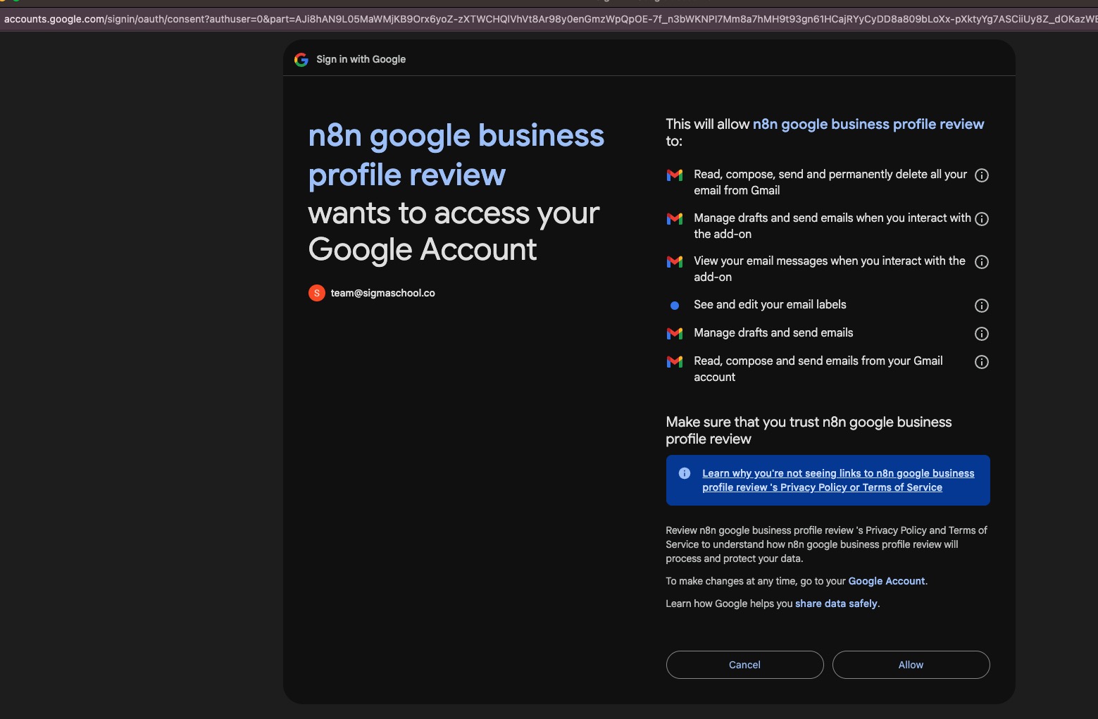 It seems to always timeout in the Login to google page, after clicking allow…. I’ve set up everything on google side correctly. Just wanted to double check with everyone here if the :5678 is supposed to be there? I see its some local host server?