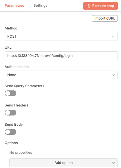 { "body": { "login": { "username": "nsroot", "password": "asdfasdf" } }, "headers": { "accept": "application/json,text/html,application/xhtml+xml,application/xml,text/*;q=0.9, image/*;q=0.8, */*;q=0.7" }, "method": "POST", "uri": "http://10.133.104.71/nitro/v1/config/login", "gzip": true, "rejectUnauthorized": true, "followRedirect": true, "resolveWithFullResponse": true, "followAllRedirects": true, "timeout": 300000, "encoding": null, "json": false, "useStream": true }