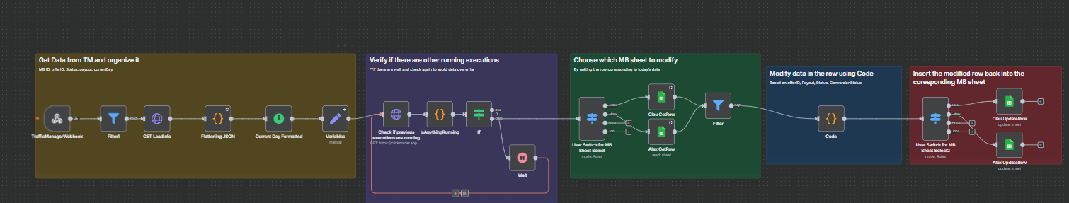 As you can see from the original post from the link, there is no error. The problem is because both executions start at the same time, when i get rows from sheets, they get the same row modify it in different ways, and when they append them, one overwrites the other. Basically one should be finished, before the other one gets to the node that retrieves the row. Thats why i was thinking that maybe a queue would solve the problem, or maybe a MUTEX ( A mutex, short for mutual exclusion, is a synchronization primitive used in concurrent programming to control access to shared resources. It prevents multiple threads or processes from accessing the same data or code simultaneously, which could lead to data corruption or unexpected behavior. Essentially, a mutex acts like a lock that allows only one thread at a time to “own” the resource, ensuring exclusive access). But this can usually be done at a hard level.