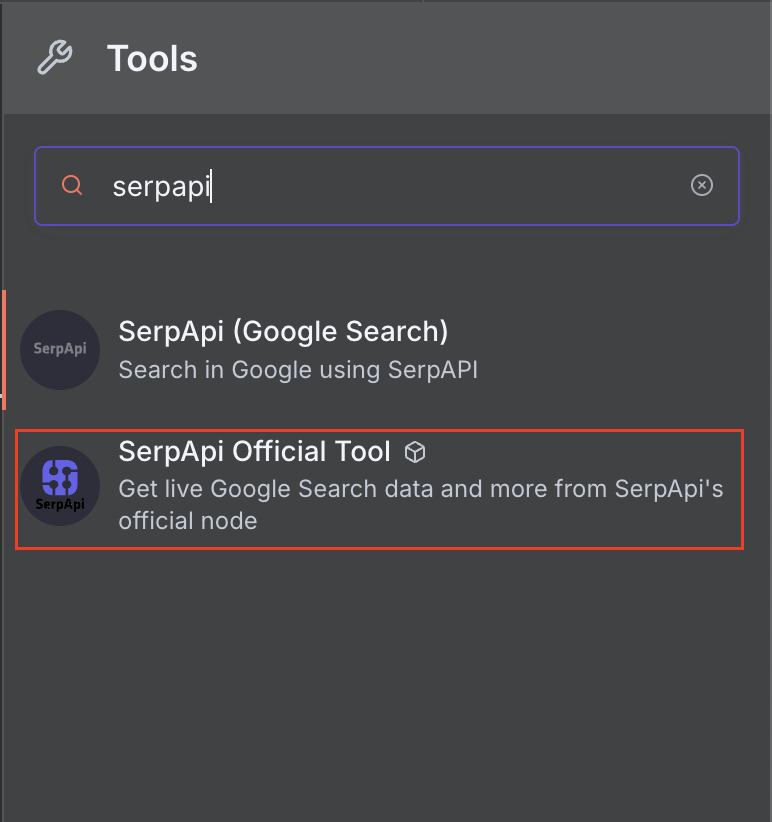 You can use the official SerpApi tool instead. This should work well. Although I can confirm some people don’t see it when searching tools, I’m not sure why. Anecdotally, both people who couldn’t see it were based in Spain, and people who could see it were in Poland (all on trial accounts).