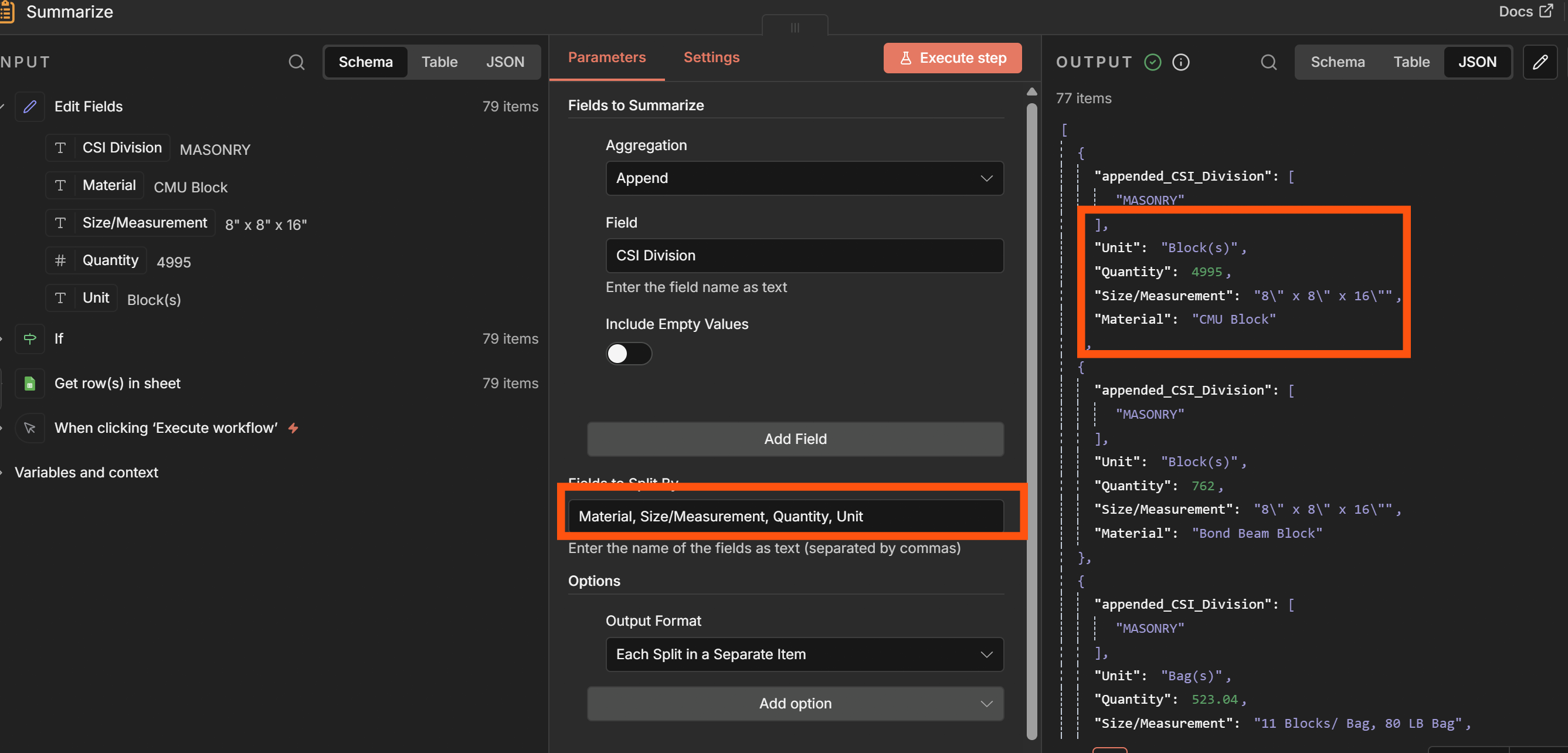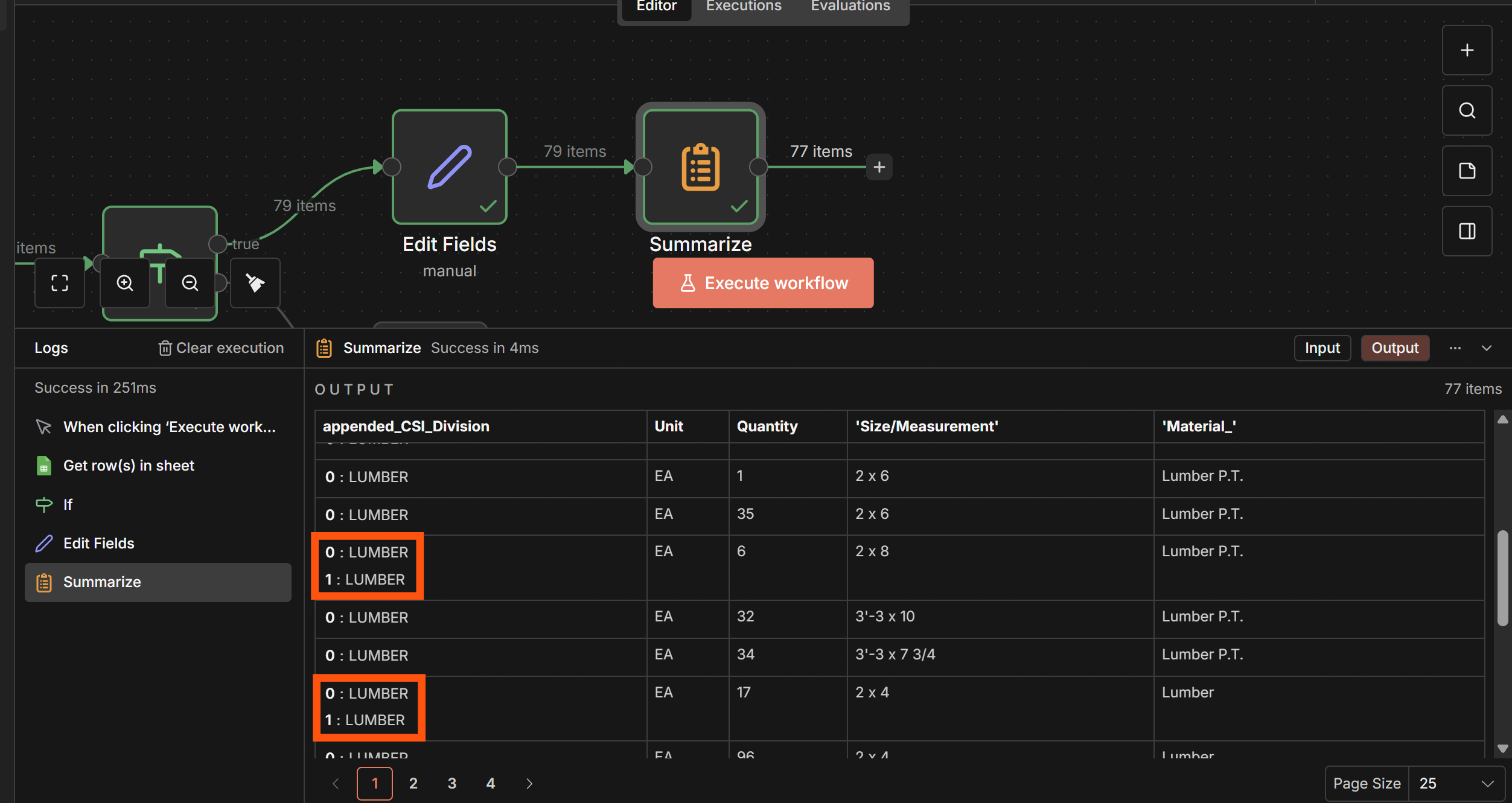 Hi everyone! Im new to n8n and im trying to create a workflow that takes quantity takeoffs from google sheets that is then sent to specific suppliers depending on the CSI division they belong to for RFQ. However, I am stuck at the data cleaning part. The number of items went from 79 to 77 and I think I can see where the missing two are but I dont know what it means. I would really appreciate a layman’s explanation and solution for this. Thank you!!