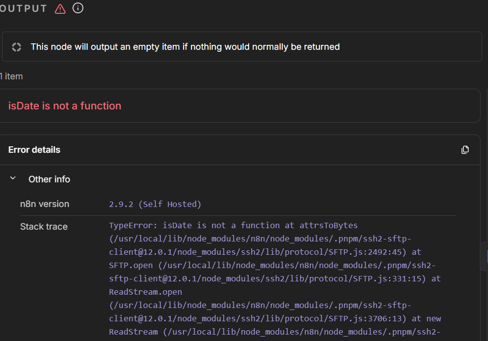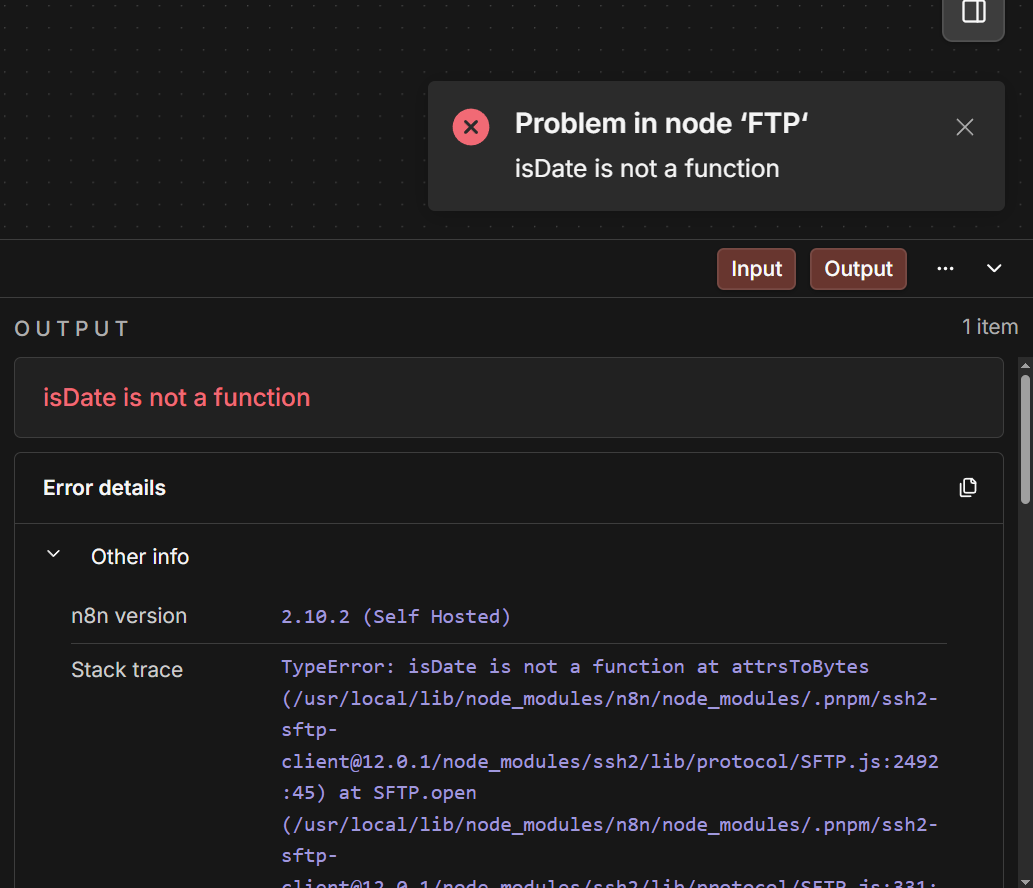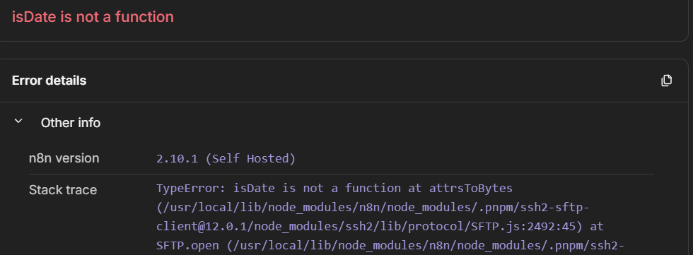 This is a dependency bug, the ssh2 library that n8n uses internally is calling util.isDate() which got removed in newer Node.js versions. It broke when 2.10.2 shipped with an updated Node runtime. Not much you can do on your end besides pinning your Docker image to the last version that worked (like n8nio/n8n:2.9.2 or whatever you were on before) until the n8n team updates the ssh2 dependency. I’d file a bug on GitHub · Where software is built so they know about it.