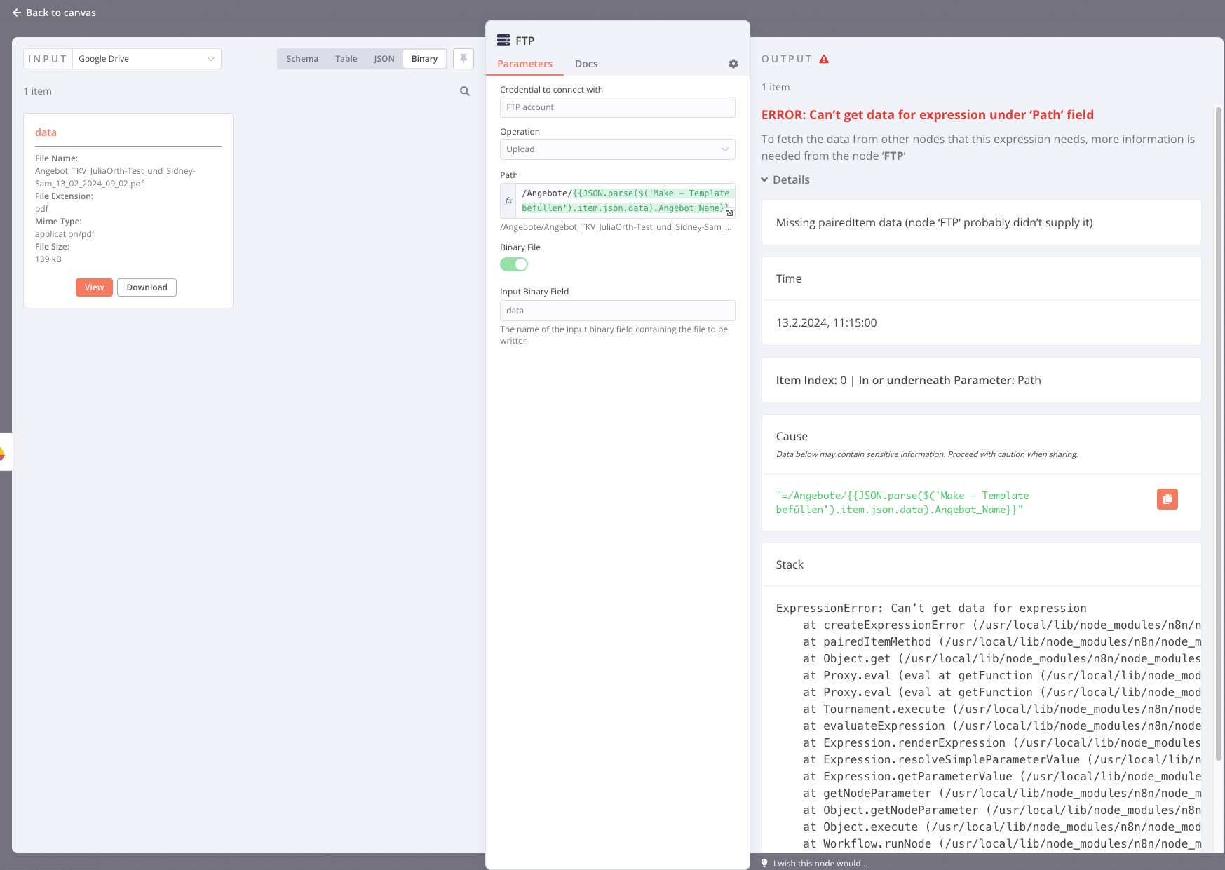Sorted the problem with the filename. Had to use /Angebote/{{ $binary.data.fileName }}