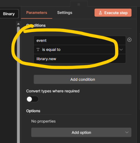 The reason your IF node is failing is that Plex sends its data as multipart/form-data . If you look at your second screenshot, you can see that the data is arriving as a binary object named payload, rather than direct JSON. n8n’s IF node can’t ‘see’ the event key because it’s still trapped inside that binary file.