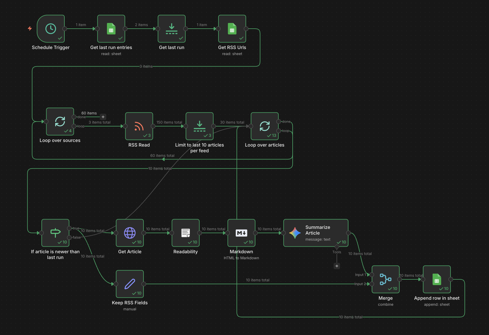 I am really struggeling to understand why this doesnt work. I load 3 different RSS feed urls from a sheet, load the feed, limit it to 10 articles and then loop over these articles, excluding the ones I already have, summarizing and saving them. But it only takes the one from the first feed/run in “Loop over articles”. If I set “Reset” on the loop, it runs infinite with the “IF” node…