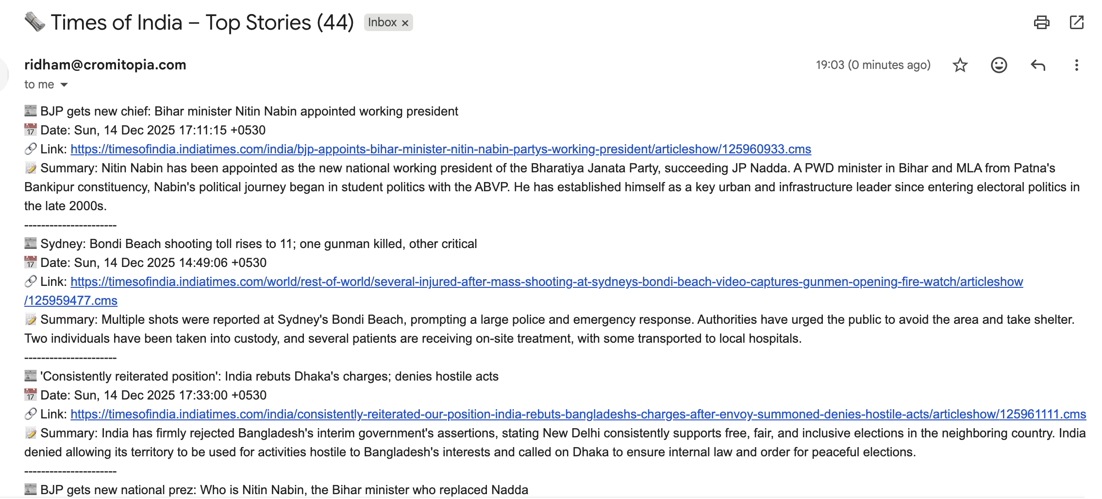 “jsCode”: “const items = $json.rss.channel.item;\n\n// Subject (email / notification title)\nconst subject = 🗞️ Los Angeles Times – Top Stories (${items.length});\n\n// Body (formatted content)\nconst body = items\n .map(i => {\n return 📰 ${i.title}\n📅 Date: ${i.pubDate}\n🔗 Link: ${i.link}\n📝 Summary: ${i.description || \"No summary available.\"};\n })\n .join(“\n----------------------\n”);\n\nreturn {\n subject,\n body\n};\n”