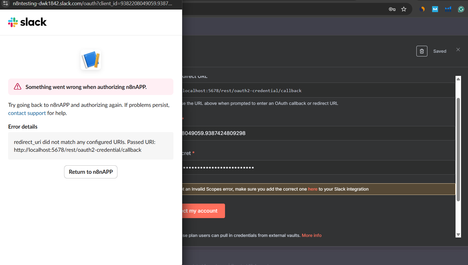 I tried to create a tunnel with ngrok, but when I authenticate the Slack node in n8n, it gives an error for mismatched URL.