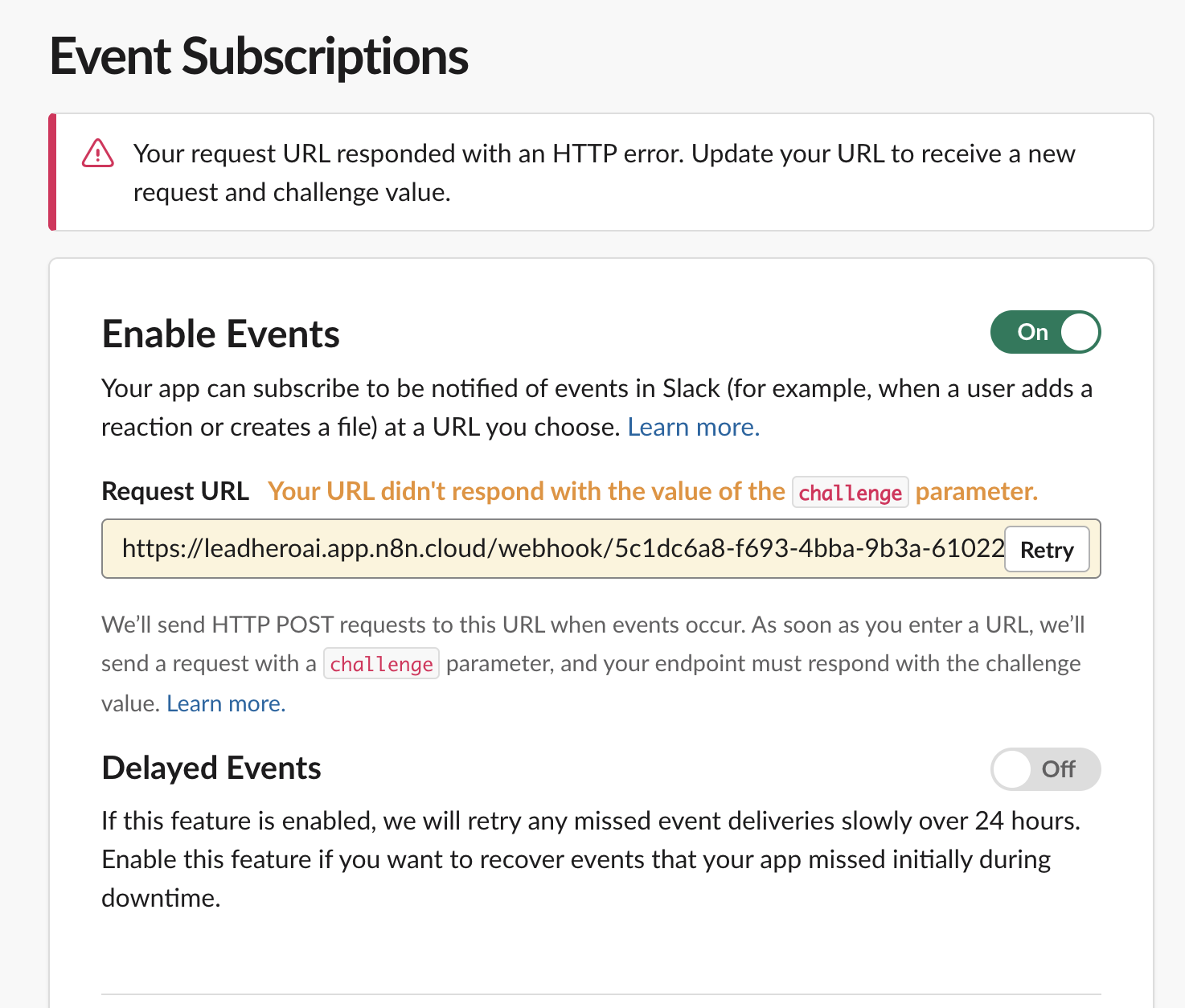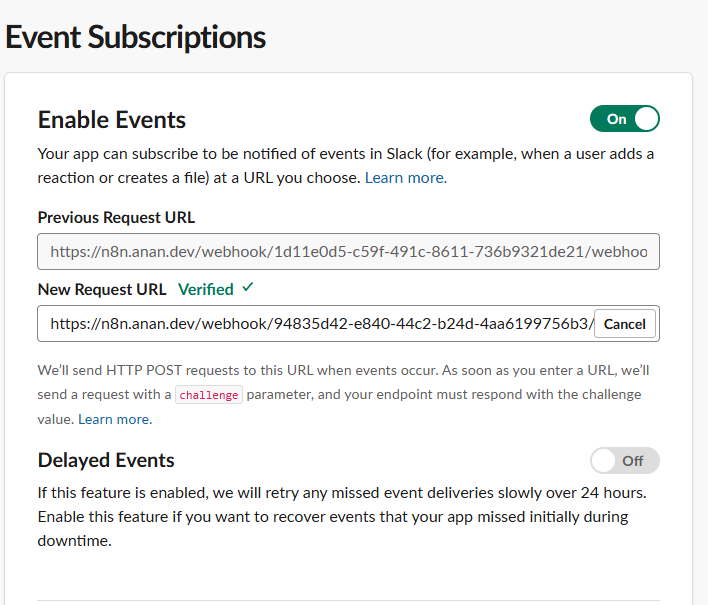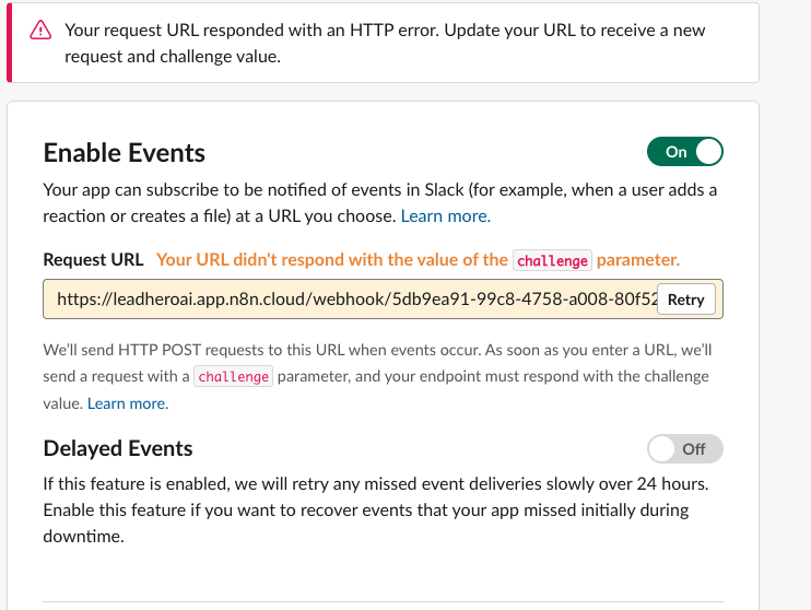 just make sure to publish your n8n production Slack trigger webhook, wait a bit, then paste the URL, It should work…