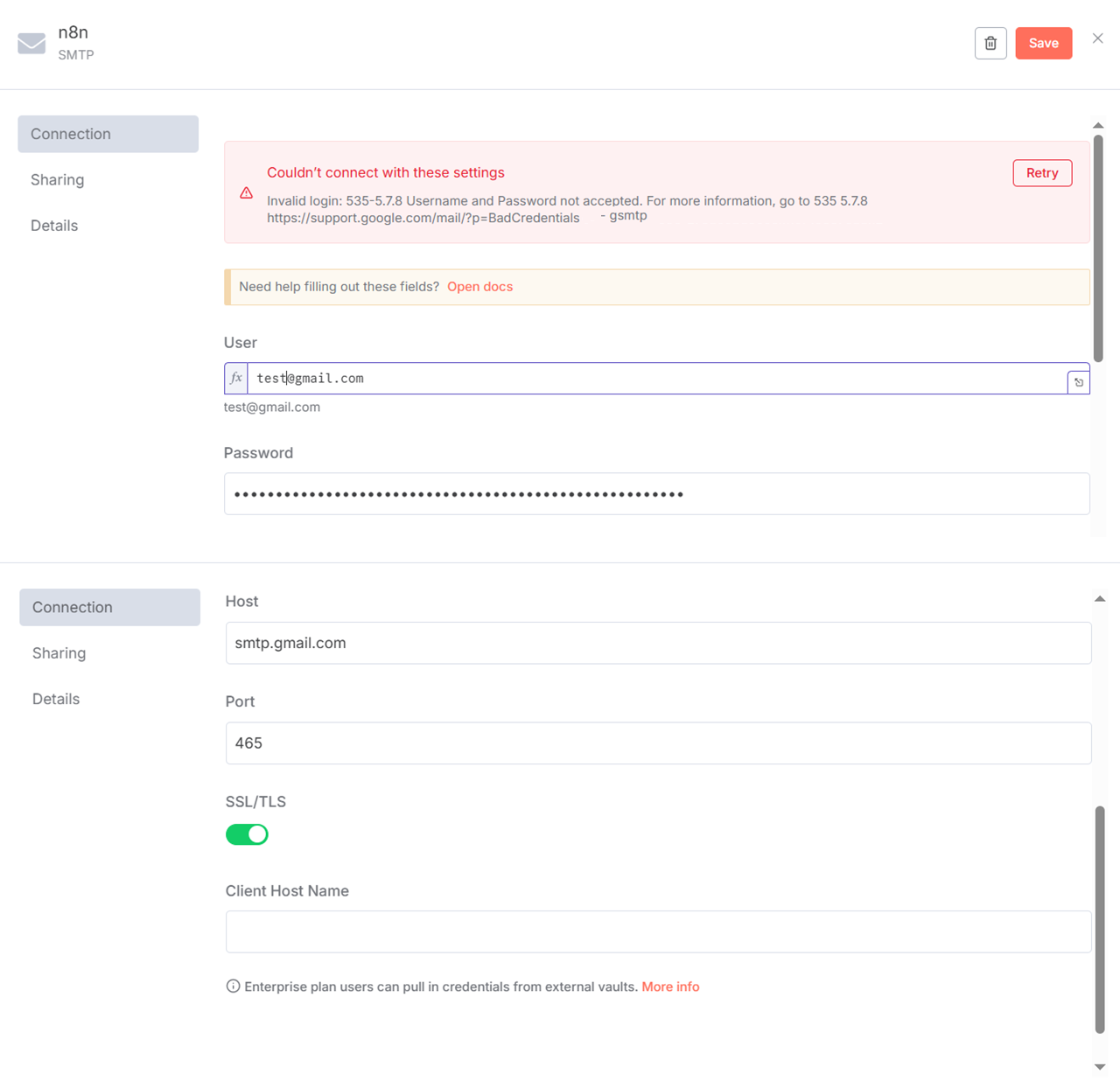 I used SEND MAIL node to send email , getting error i used proper user mail and app password but getting error.