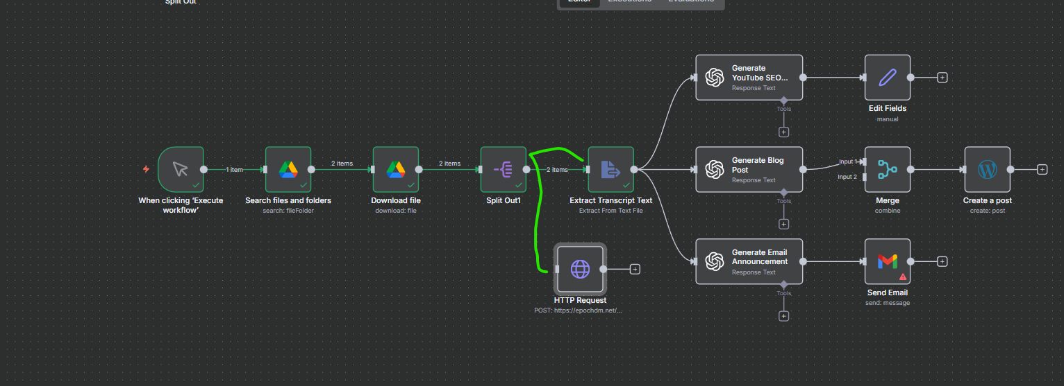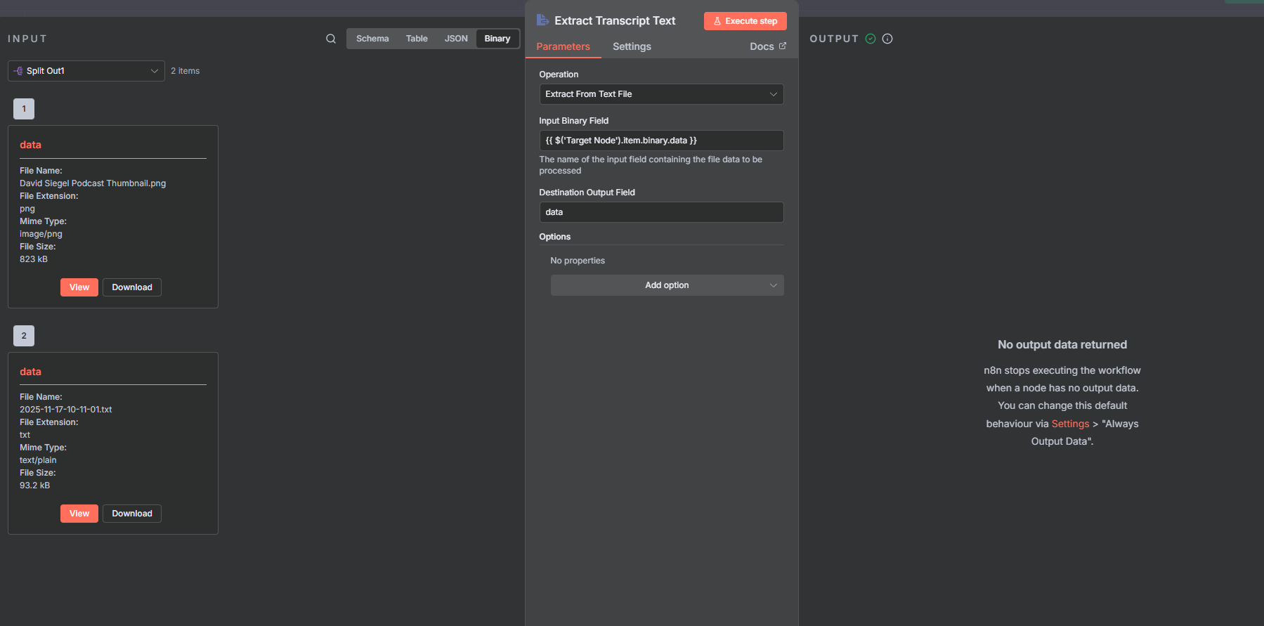 I would like to send the text file to the “extract transcript” node, and the image to the HTTP Request node to add it to the media library of the wordpress site, to then be used in the blog post.