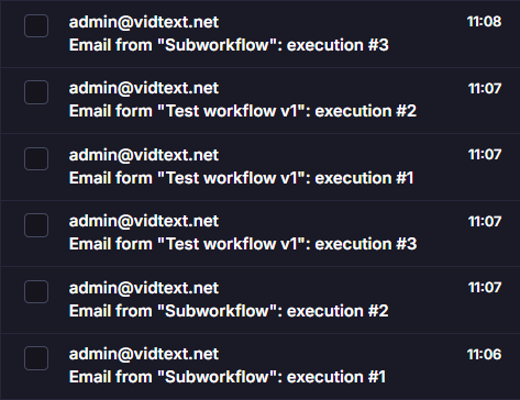- 2 emails at T+30secs: one from “Test workflow v1” and one from “Subworkflow”