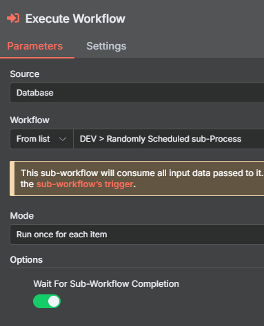 The “Execute Workflow” node call is configured as such: