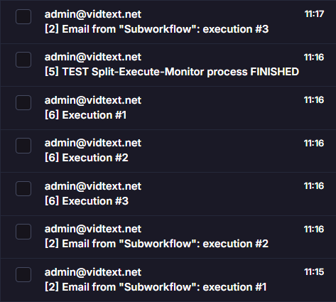 - 4 emails at T+90secs from “Subworkflow” execution #2 and all 3 emails from "Test workflow v1" at once
