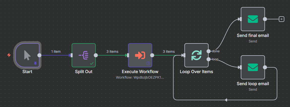- First, 3 items are passed onto “Execute Workflow” node