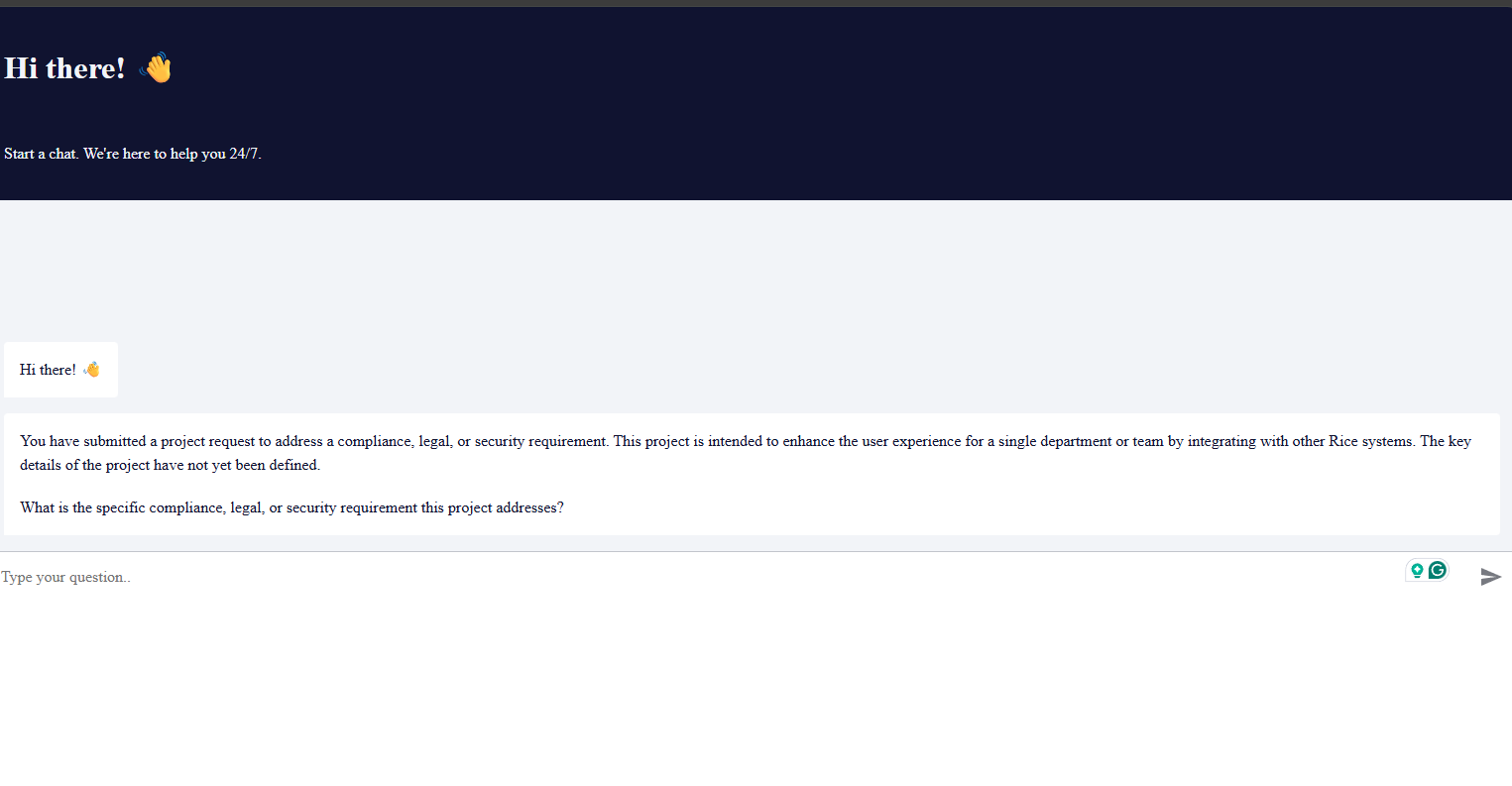 Questions from the agent appear after the form is processed, and the only chat responses the user gives are always in response to an agent question–there is no open discussion.