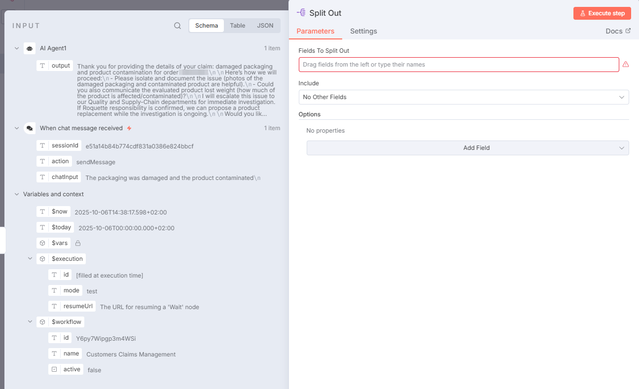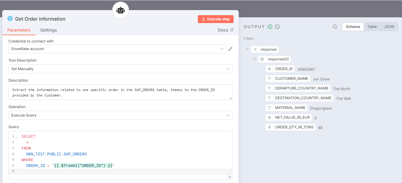 The workflow I’ve built gets an order reference through the chat {{ $fromAI(“ORDER_ID”) }} and retrieves the corresponding information in a Snowflake table.