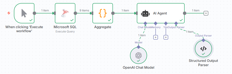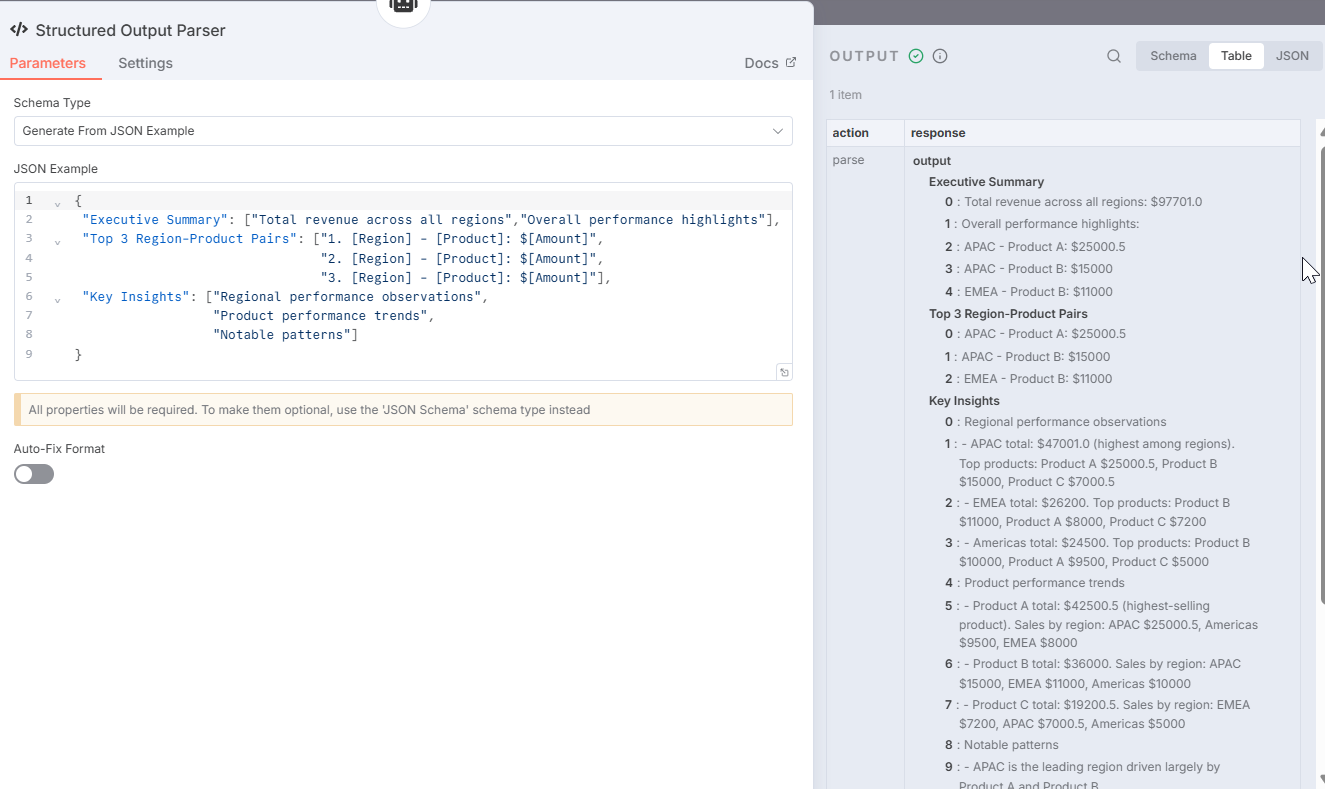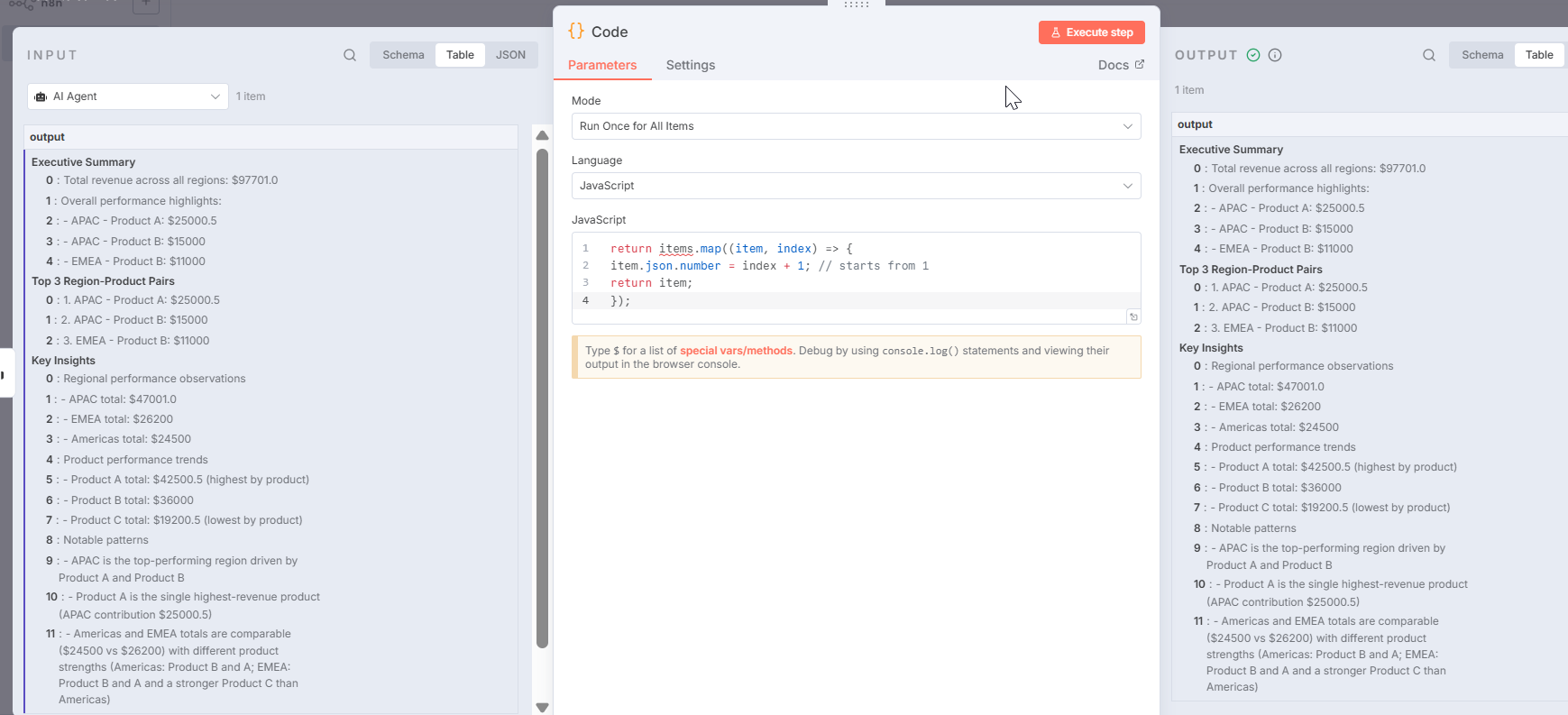 Then you can link this output to Gmail (or any other node) and use {{$json.Executive Summary}} to reference the 1-based numbering in your email or message