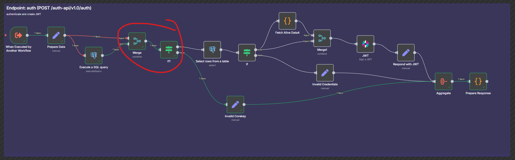 So, the problem in my workflow was, that there is an if node, that checks if the so-called corekey exists, before further checks are carried out. For the âinvalid corekeyâ route, the merge node is not getting itâs second input, as the if node activated the other route and so the merge node was waiting for the second input. (see screenshot).