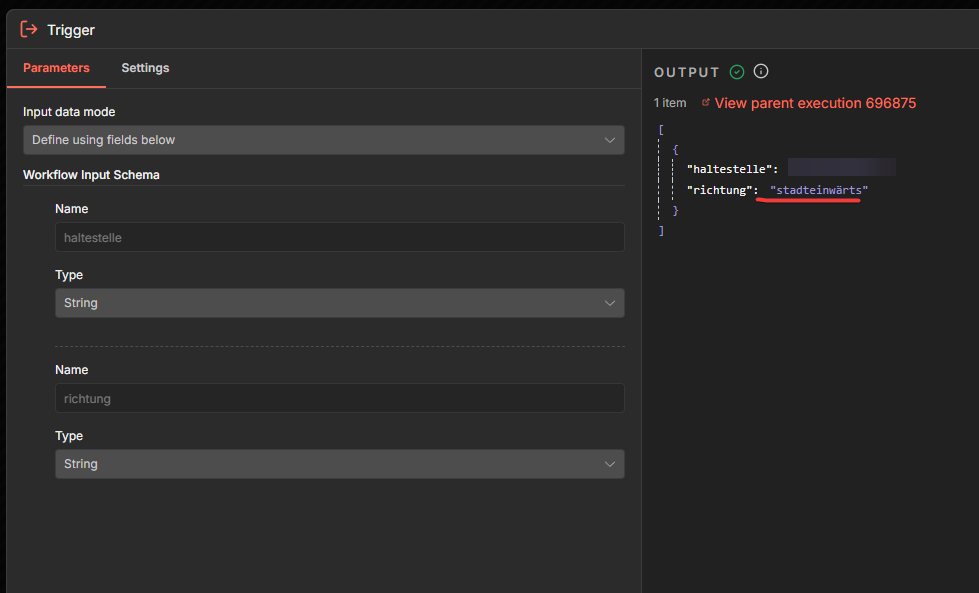 I did some more testing and found out, the “richtung”:”stadteinwärts” field was like frozen. Even if I removed it from the inputs (in both the main workflow, and the expected inputs), it still appeared with the other fields.