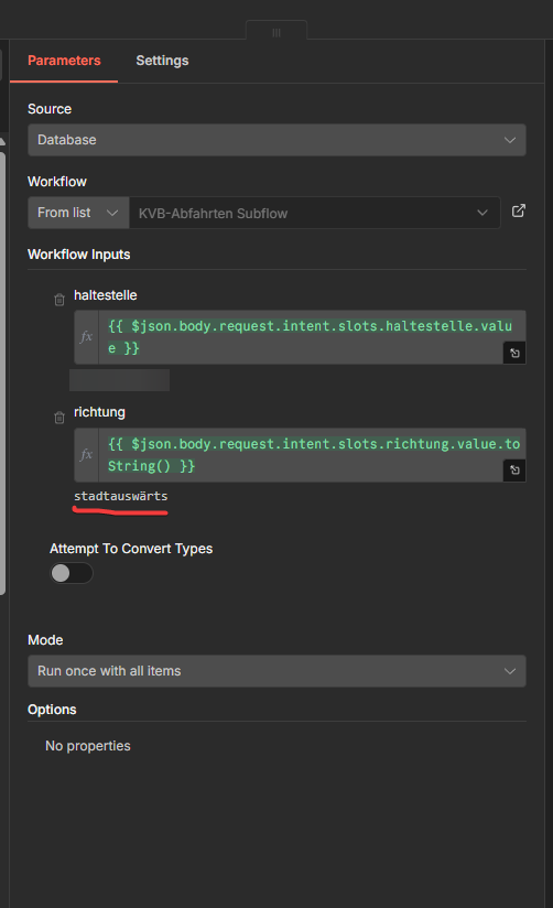 Hey, I’m having problems with the “Execute sub-workflow” node as well as the Trigger of the sub-workflow. I’m passing on a string value called “richting”, which can either be “stadteinwärts” or “stadtauswärts”. However, in the execution of the sub-workflow, it always reverts to “stadteinwärts”. I’m very confused. Already restarted and updated n8n, but it still happens.