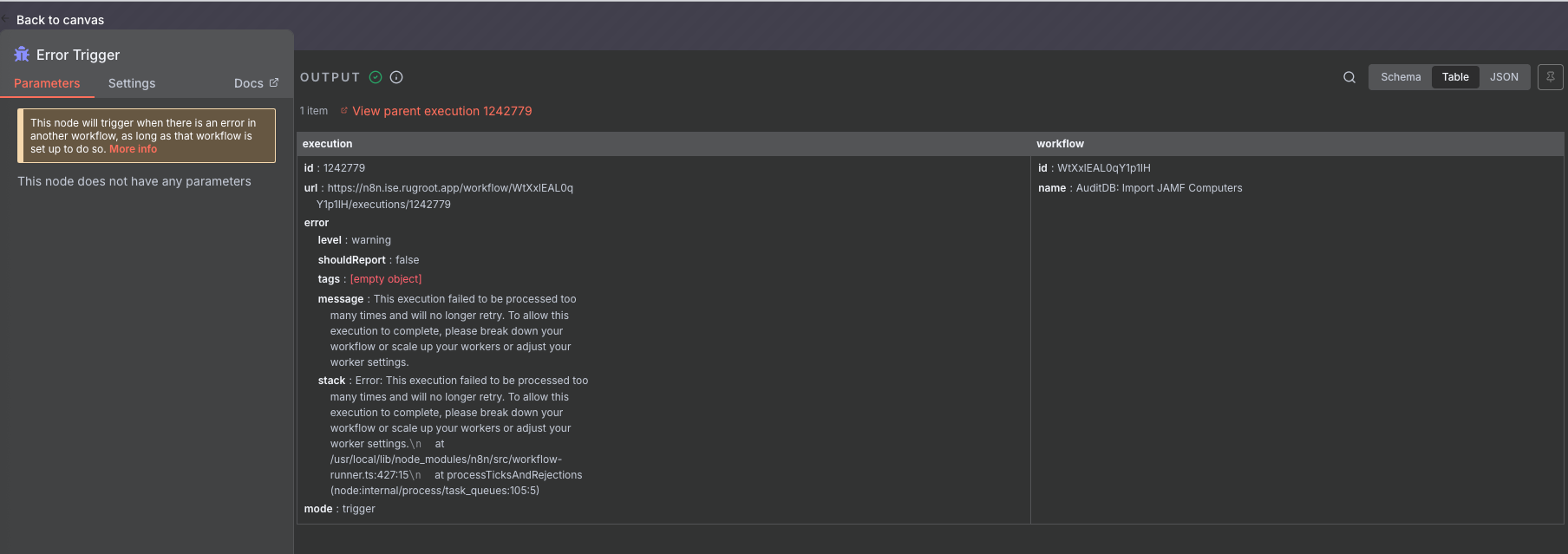 "message": "This execution failed to be processed too many times and will no longer retry. To allow this execution to complete, please break down your workflow or scale up your workers or adjust your worker settings.",