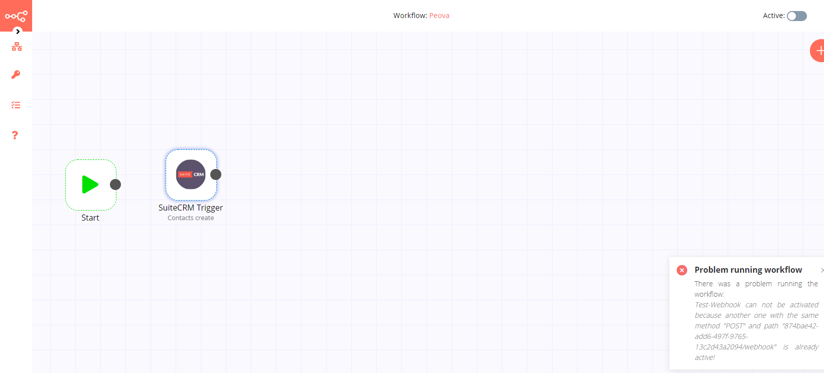 Hey @marconte21870, will check this out later today. There a known bug with the trigger right now. If something fails while executing one of the lifecycles method checkExist, create, delete the webhook it’s not unregistered automatically. That is the reason you get the message Test webhook cannot be activated because ...... You gotta wait 2 min so it unregisters automatically or just create a new workflow. Either way this should happen just in test mode and not when you active the workflow (production). Will keep you posted.