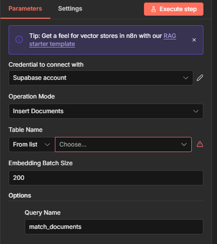 Currently am i trying to connect supabase to n8n. I create a documents table in supabase using the guide and setup my credential for supabase with gave a succes.