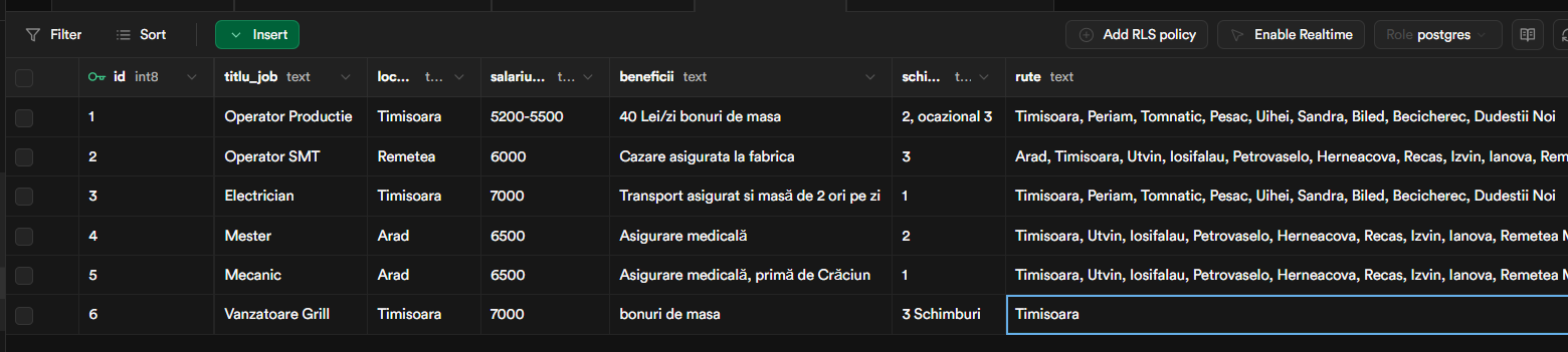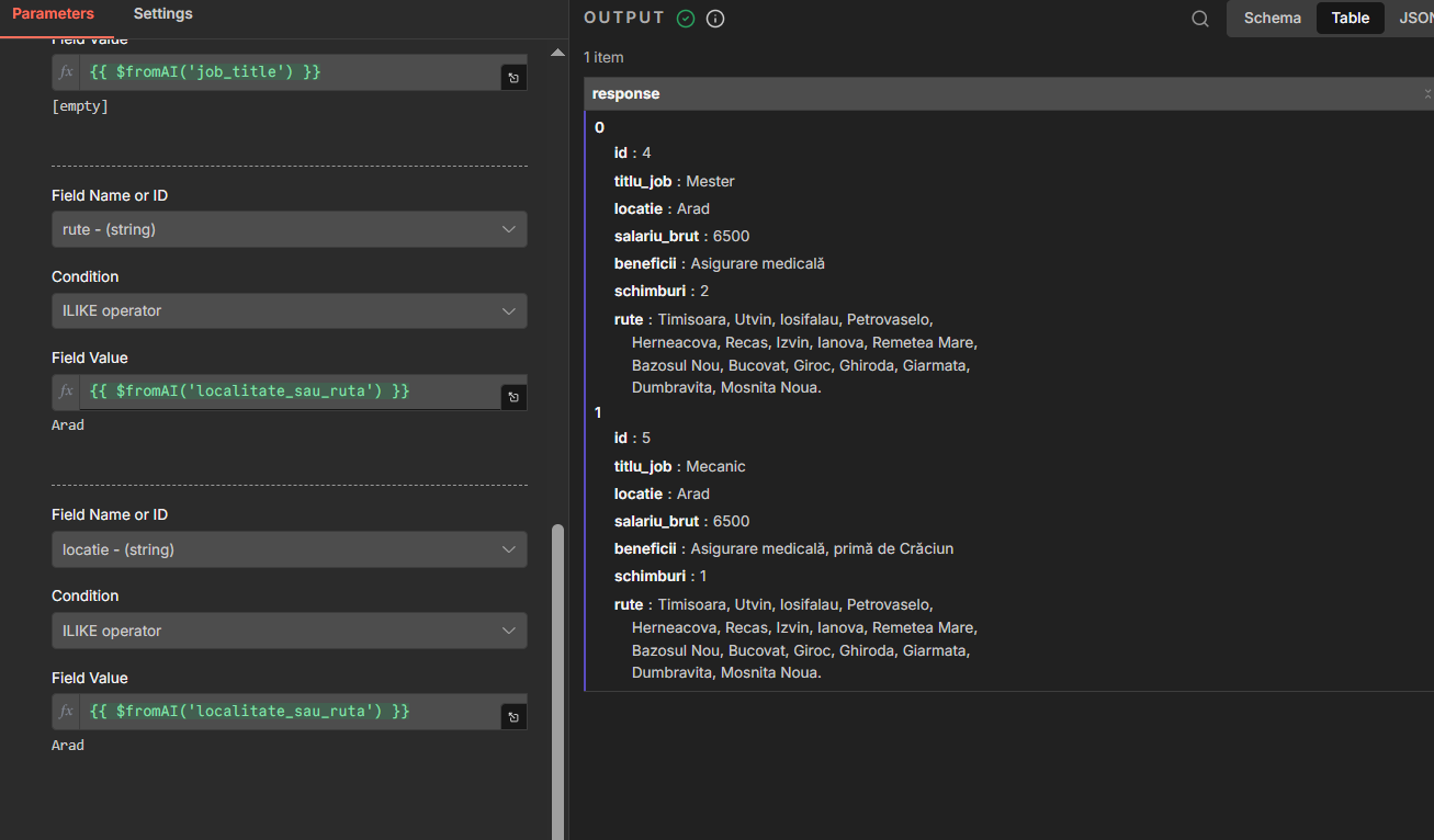 It looks to return any row with a job that has either on job_title, rute (routes) or locatie (location/city) given by the agent. If the agents gives both inputs then it should search for both filters, but if one is empty it can search by only one variable.