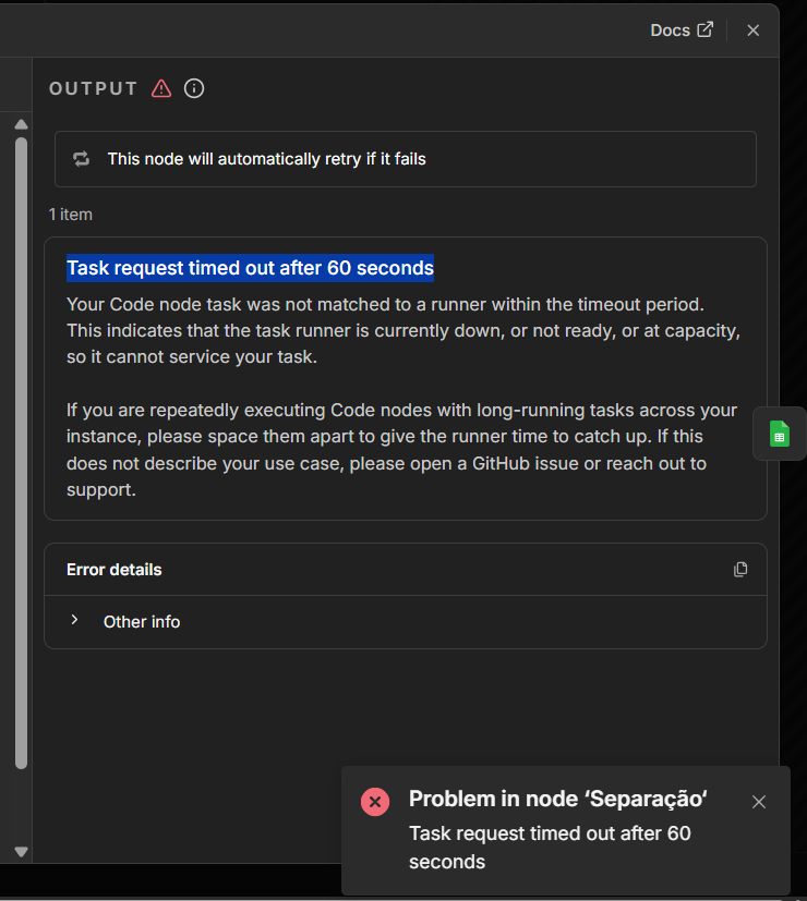 My n8n flows aren’t working every time they reach the code node. At first, I thought it was just one code node, but I checked the others and it’s happening in all of them that use code as a node. "Task request timed out after 60 seconds