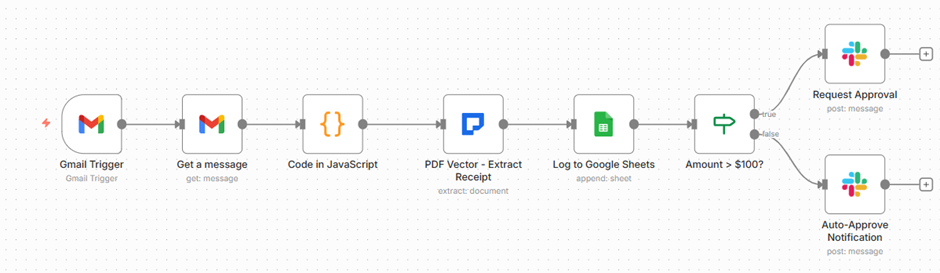 Built a workflow where people just email their receipt photos and everything gets logged automatically. Expenses over $100 go to Slack for approval, under $100 auto-approve.