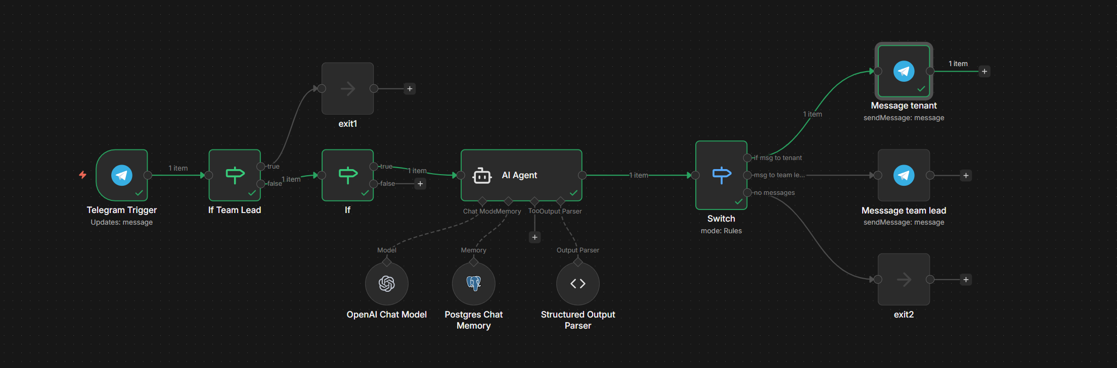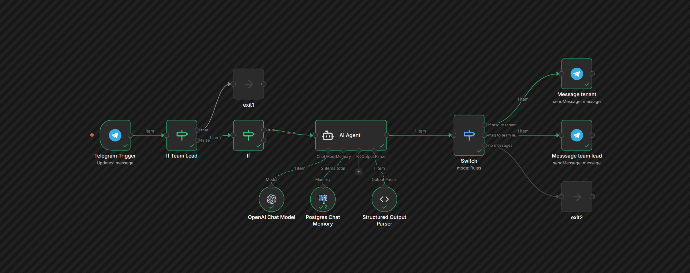 I am building a Telegram AI agent in n8n to automatically communicate with tenants. The agent decides whether it can answer directly or needs to escalate the message to a team lead.