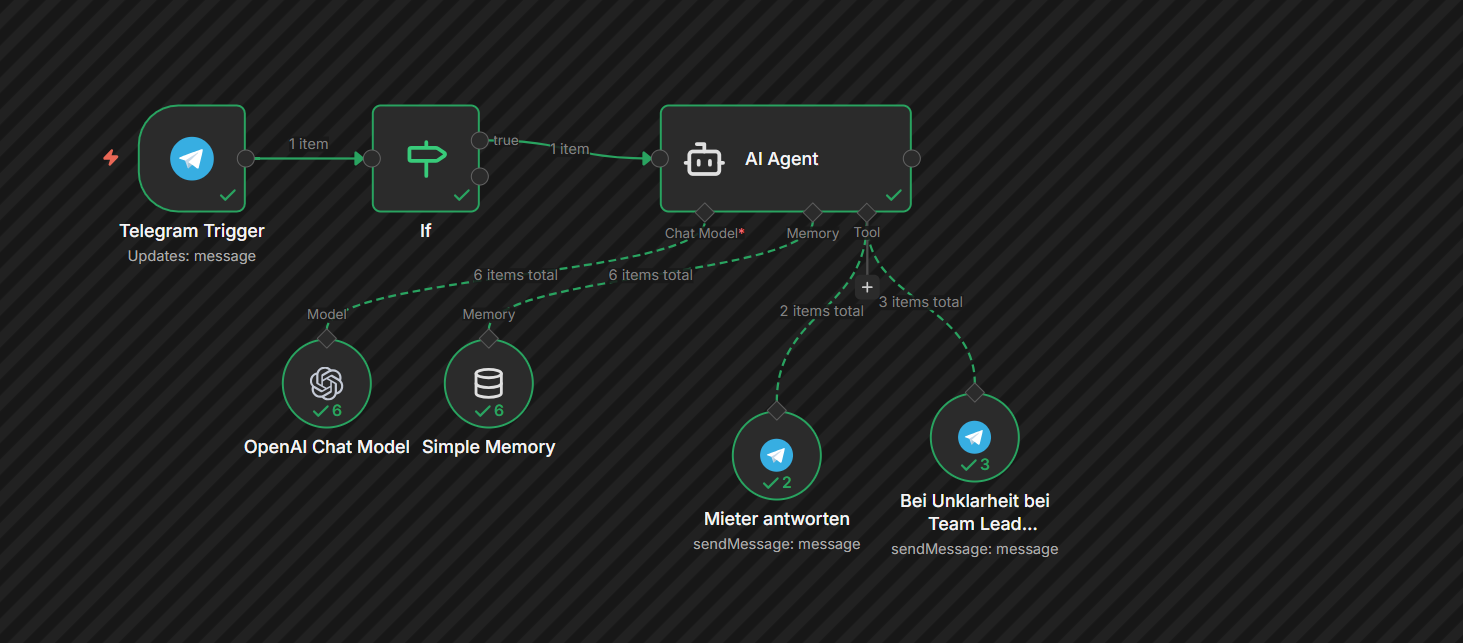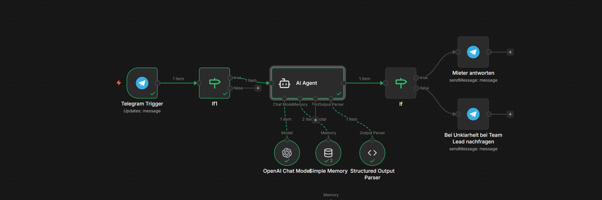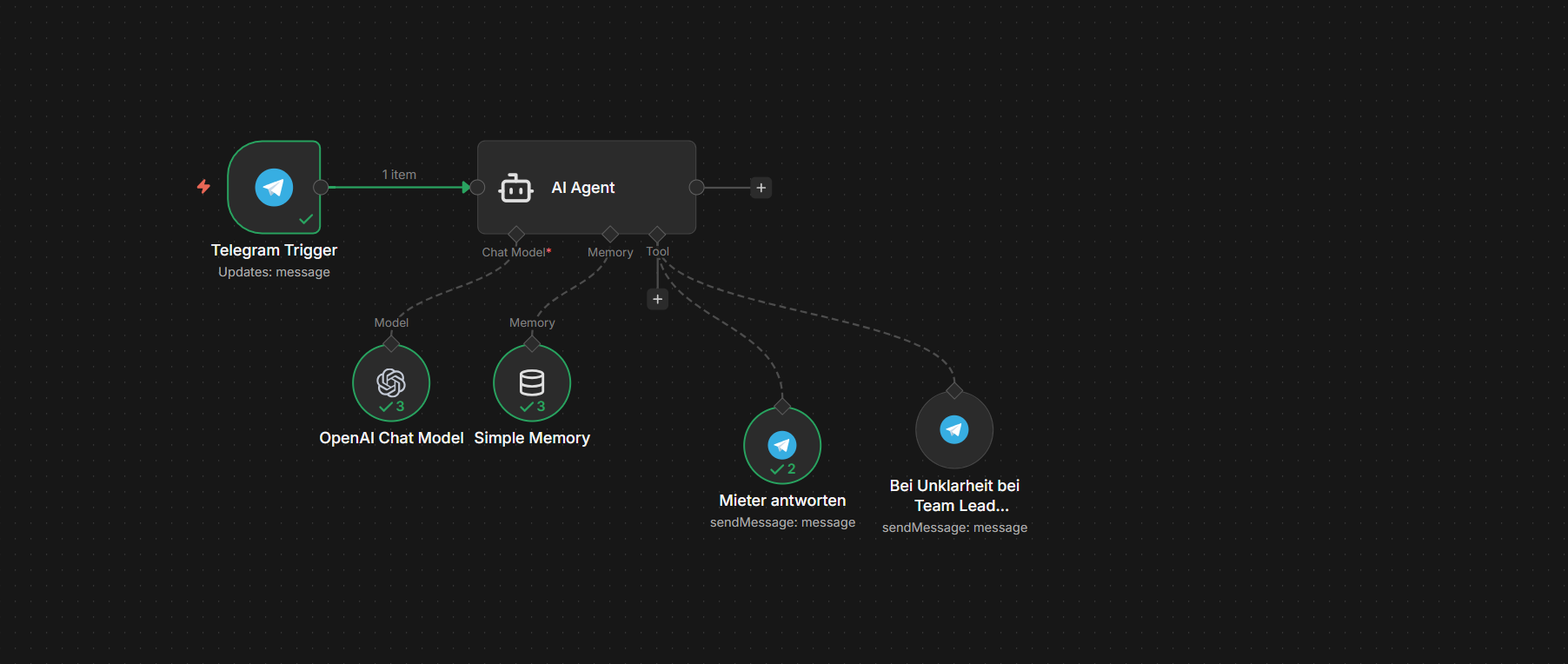 - Telegram Tool “Mieter antworten”: Sends a message to the tenant.
