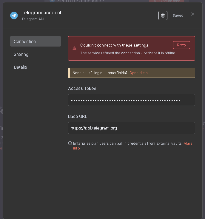 when I’m trying to set credentials for telegram I get this error message.
