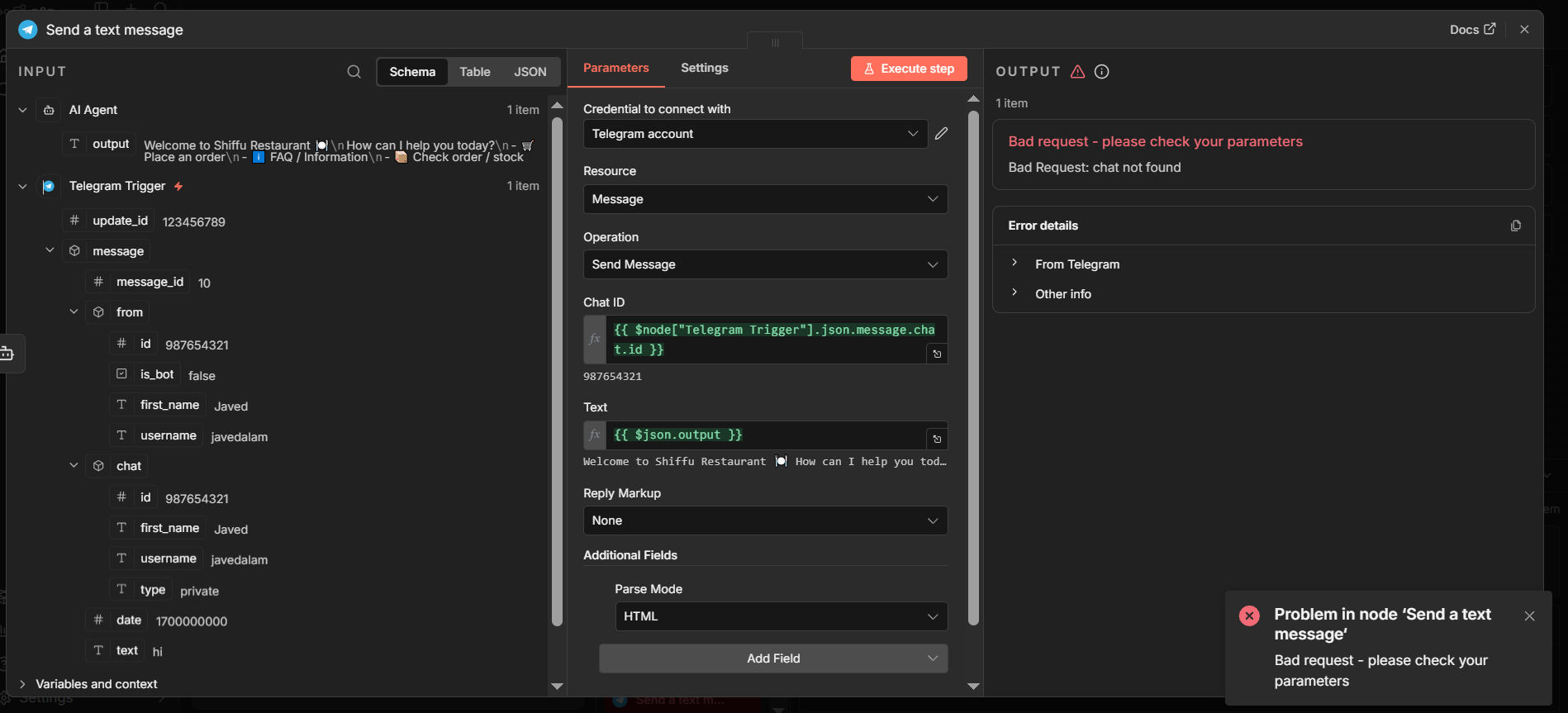Parse Mode is set to HTML, and the message text is coming from the AI Agent output ({{$json.output}}).
