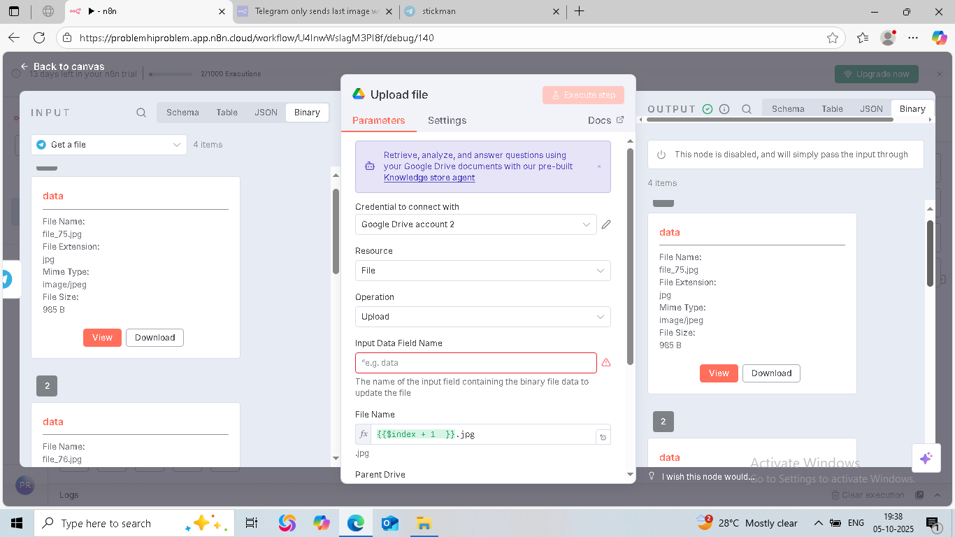 Earlier, my workflow was working perfectly — whenever I sent multiple images (for example, 3 images) to my Telegram bot, it would handle each one separately. Each image was downloaded using the Telegram Get node and then uploaded to Google Drive individually.
