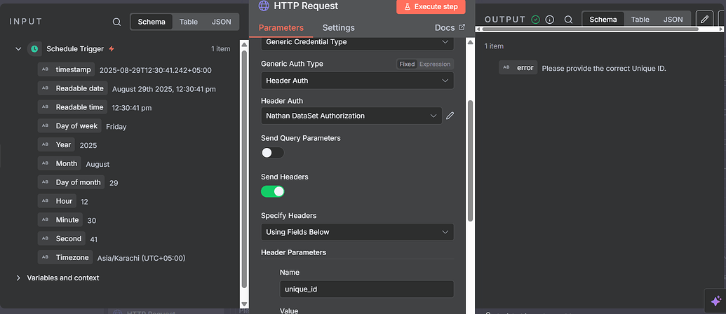 You need to re-run the workflow that gets the data from the warehouse with the level2-erp endpoint. This is the one that needs your unique_id as a header parameter.