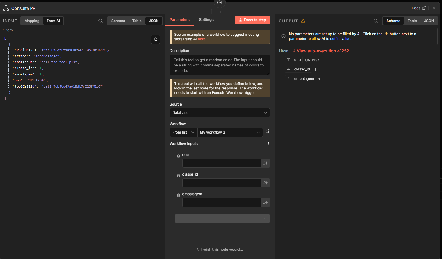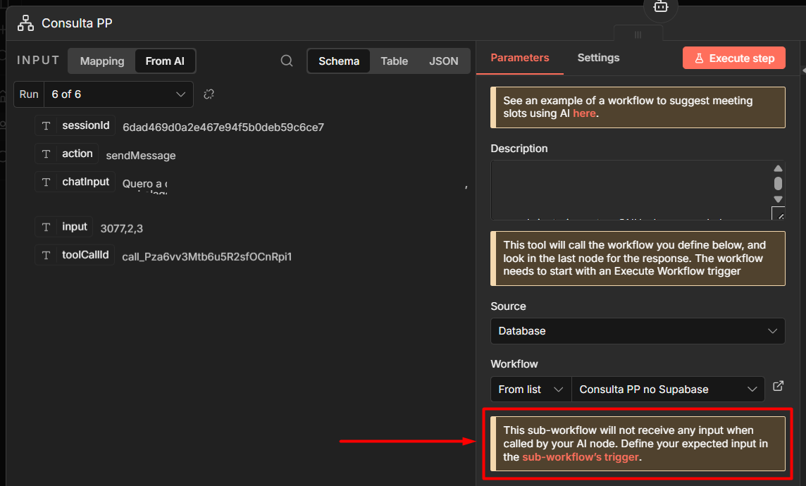 In my PP Query node, which is in the AI Tool, there’s a yellow box in the Parameters tab, right at the bottom, that says: “This sub-workflow will not receive any input when called by your AI node. Define your expected input in the sub-workflow’s trigger.”