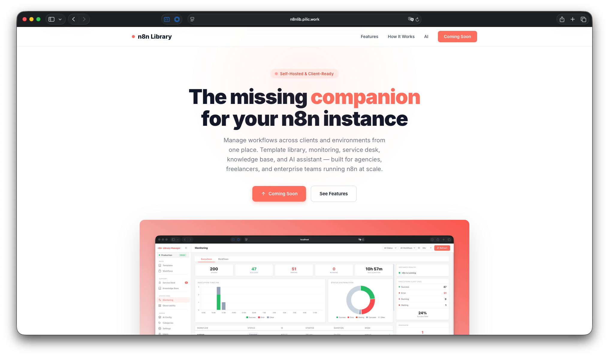 Manage workflows across clients and environments from one place. Template library, monitoring, service desk, knowledge base, and AI assistant — built for agencies, freelancers, and enterprise teams running n8n at scale.