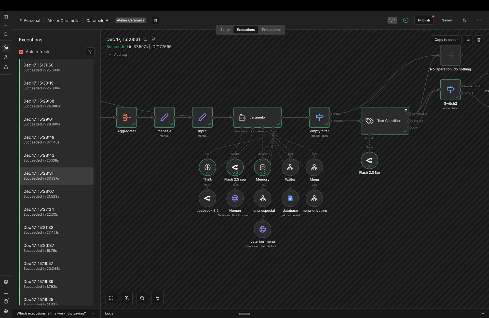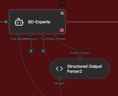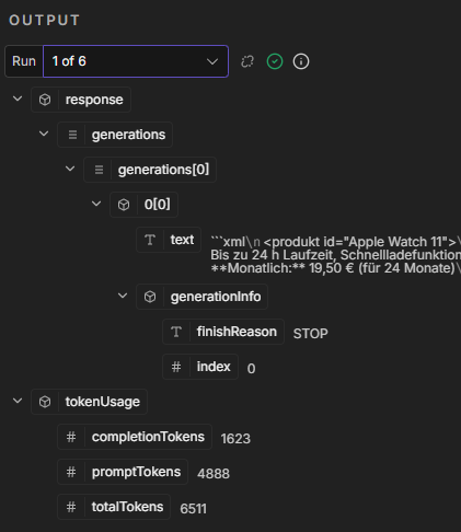 The interesting part: Going into the connected model node shows that the very first run seems to have output something. For some reason (probably due to the response format node) it starts another run but now outputting given error.