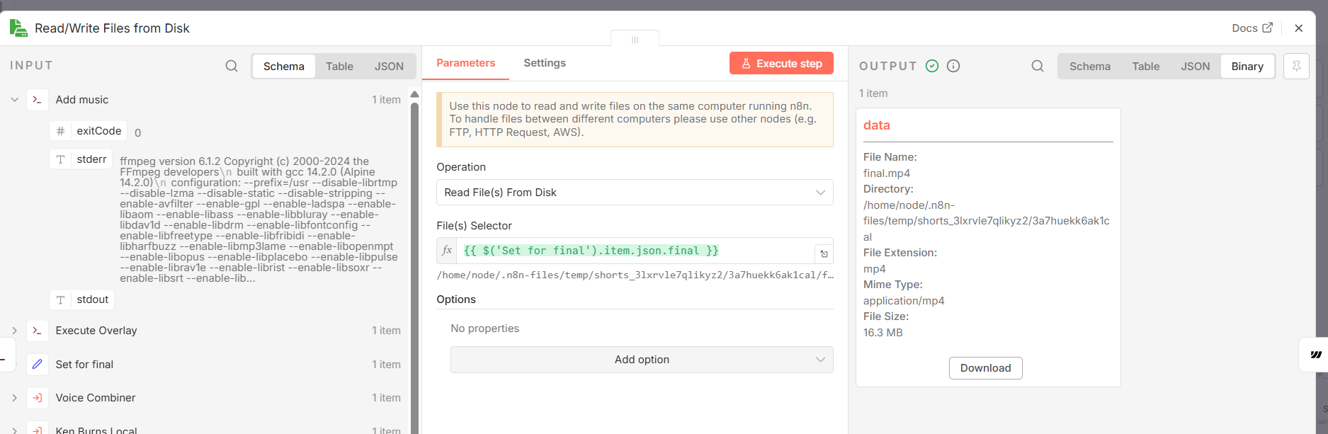 1. Create a workflow that writes a .mp4 file using the Read/Write Files from Disk node.