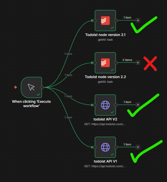 As today is the official date for the shutdown of the Todoist v2 API, I started replacing Todoist nodes version 2.1 in my workflows with the new version 2.2. However, the 2.2 nodes seem to be totally ignoring the ‘filter’ option, and the node returns every task in my todoist. Anybody else experiencing the same?