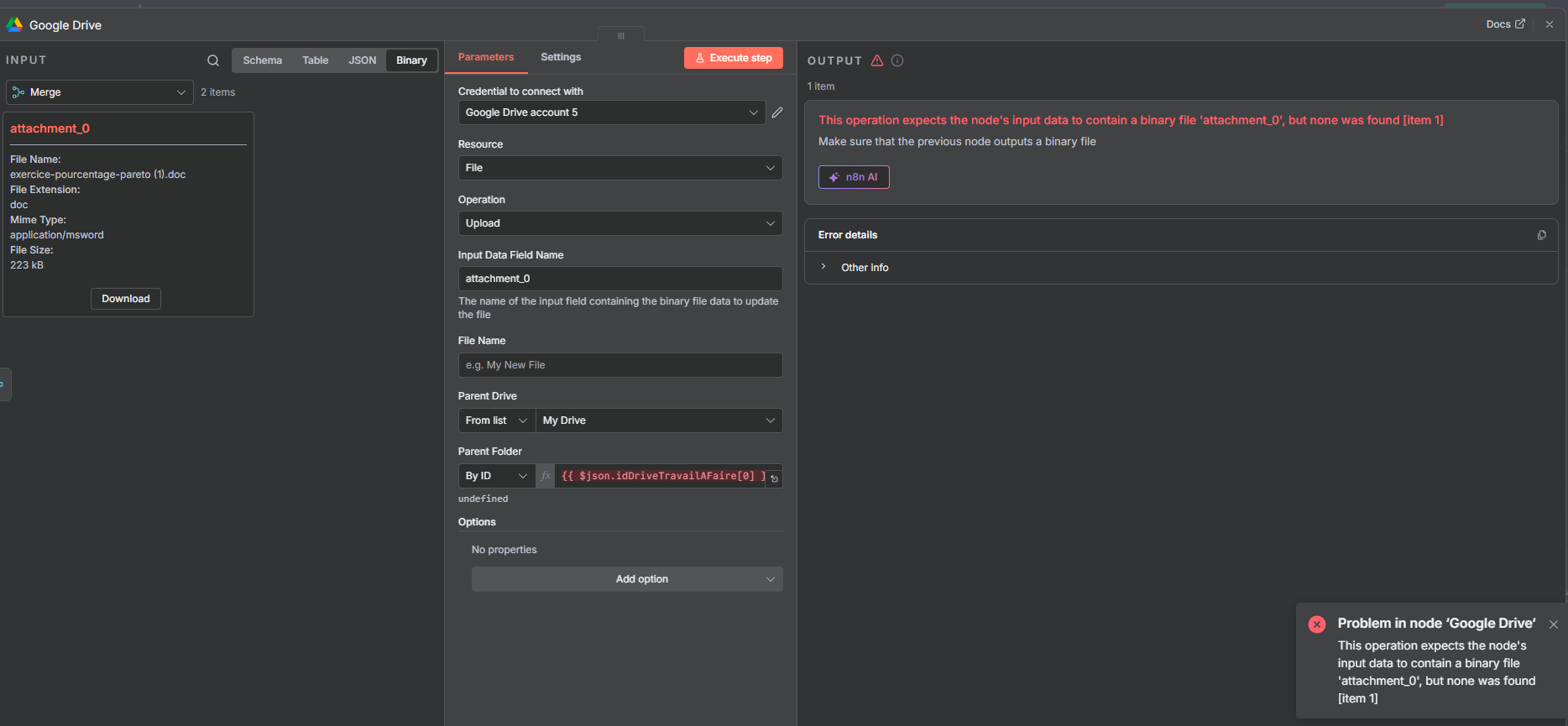 This operation expects the node’s input data to contain a binary file ‘attachment_0’, but none was found [item 1]