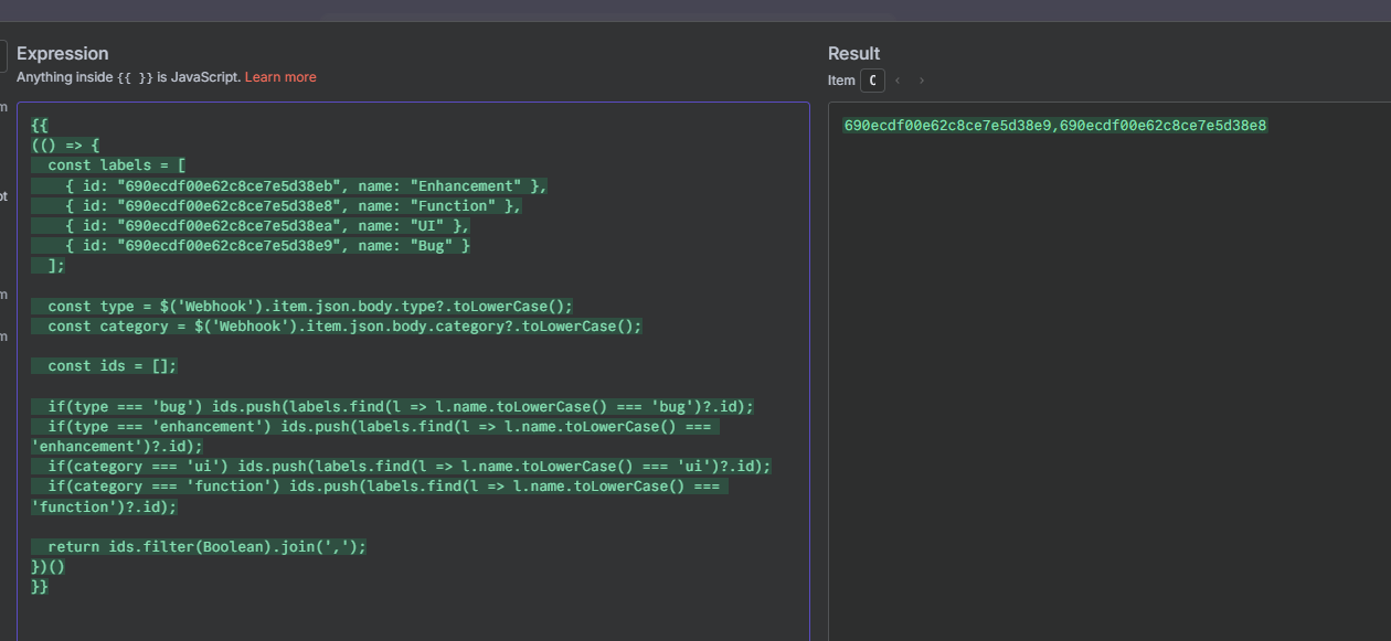 I’m sending exactly one or two labels depending on the webhook, e.g., "bug" + "ui".