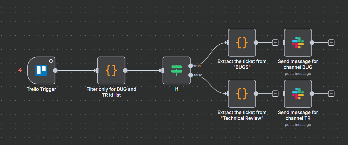 Then I immediately filter the incoming events with a Function node to process only when a card is created or moved into specific lists (e.g., “Bugs” or “Technical Review”)