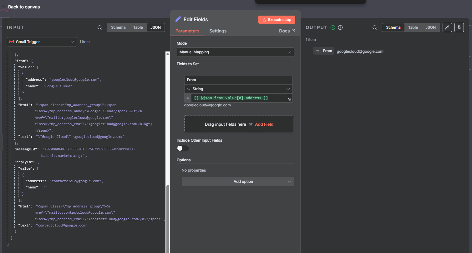 Because of this, the Merge node fails when I try to match the Gmail sender email to the Google Sheets Email column (the values don’t line up).
