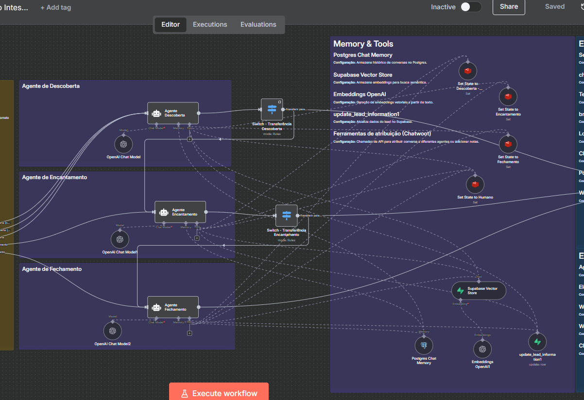 I’m working on a WhatsApp sales assistant built in n8n using the AI Agent node. The flow is structured with 3 agents: Descoberta → Encantamento → Fechamento.