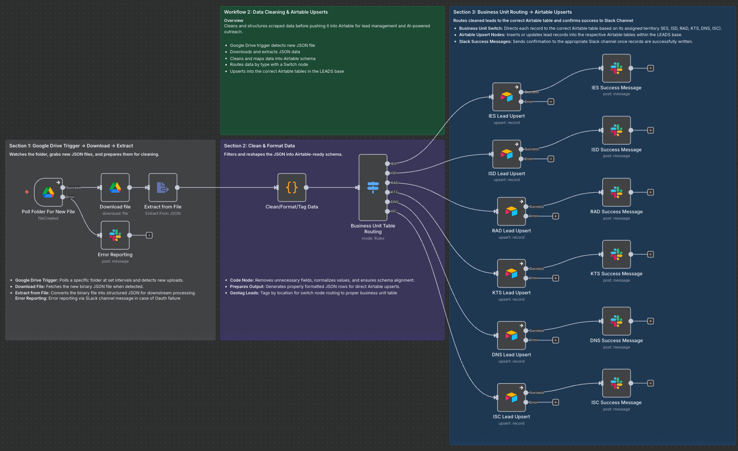 As the Business Development Director for a multi-MSP portfolio, one of my biggest challenges is consistently sourcing, cleaning, and organizing new lead data across multiple regions. I wanted to share a two-part workflow I recently built in n8n that has streamlined this entire process and given me a scalable system for lead generation, enrichment, and outreach automation.
