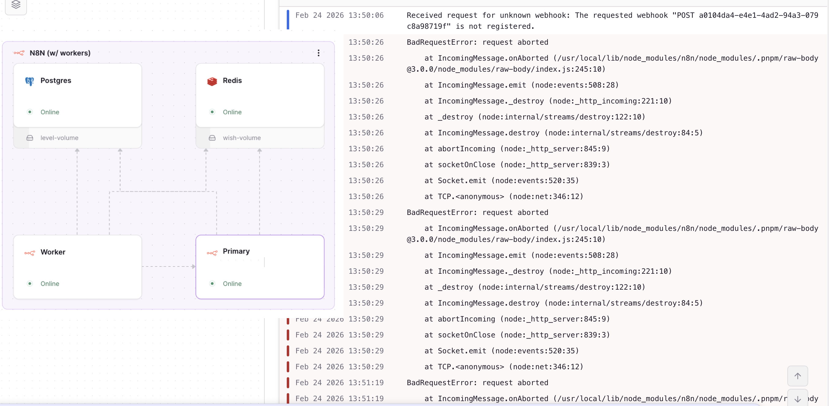 I’m facing a critical issue that started yesterday without any changes to my infrastructure. My n8n UI keeps showing the “Offline” message and I’m being spammed with BadRequestError: request aborted errors in the logs.